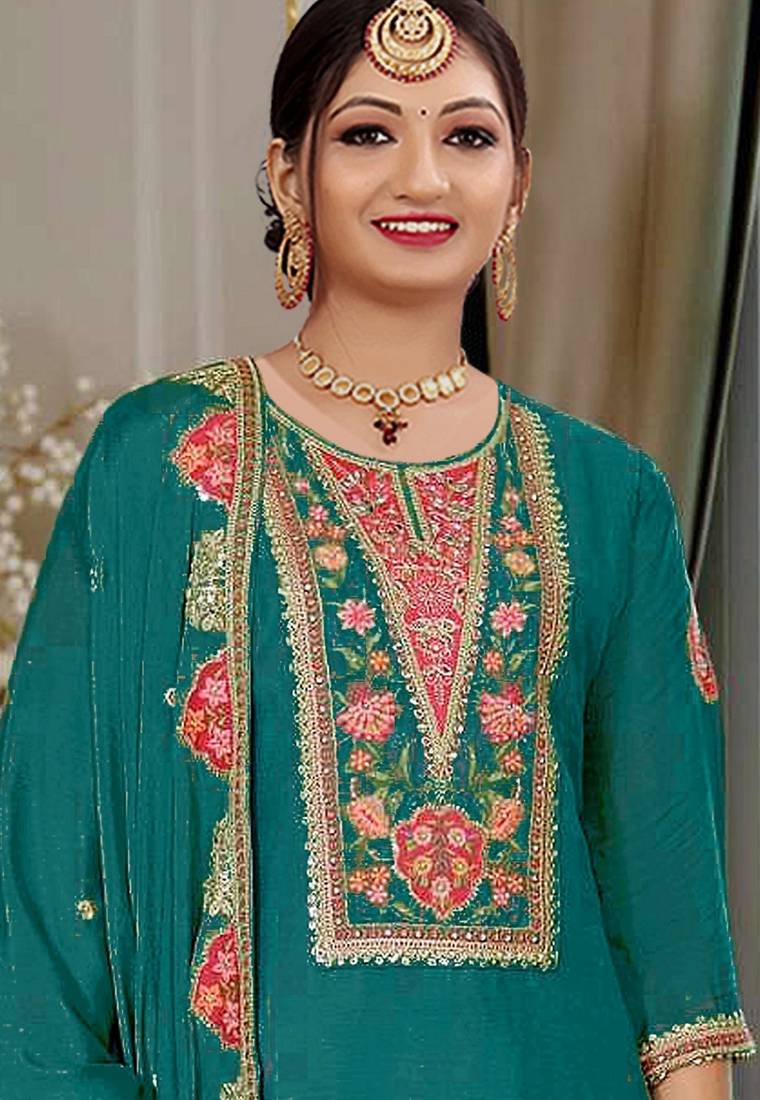 | Product Name | Teal Color Beautiful Embroidered Chinon Fabric Palazzo Dress | |
