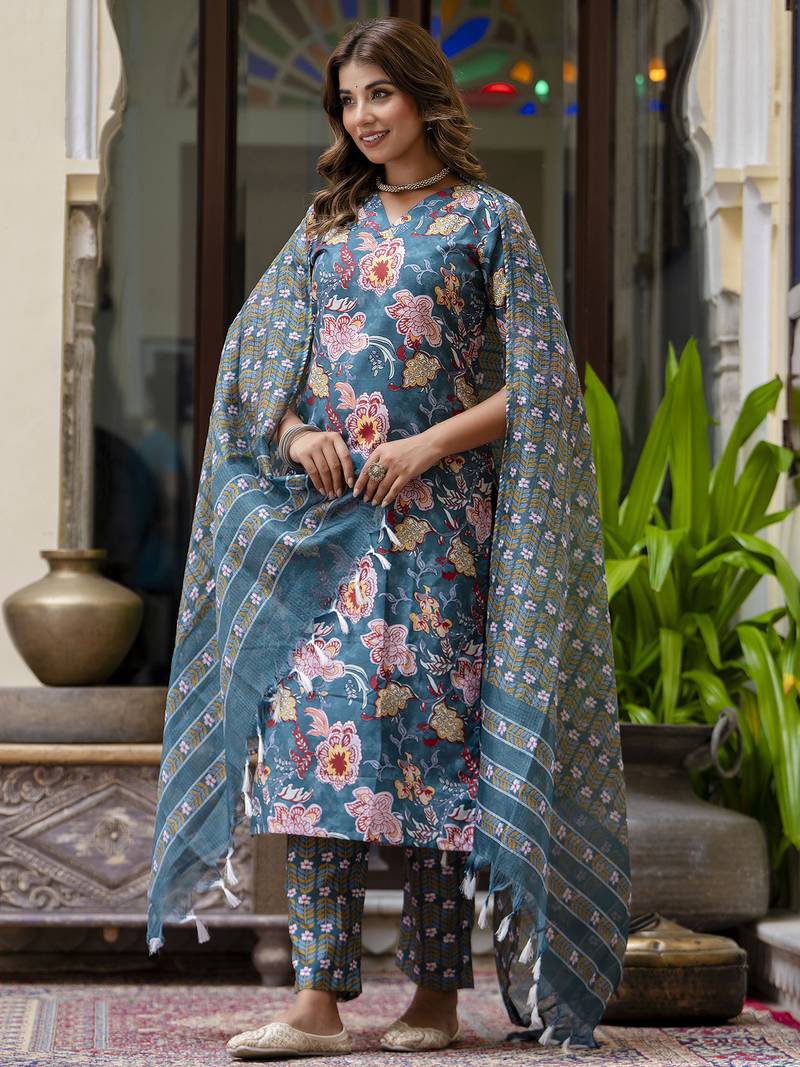 Teal color beautiful floral printed cotton blended foral rich suit