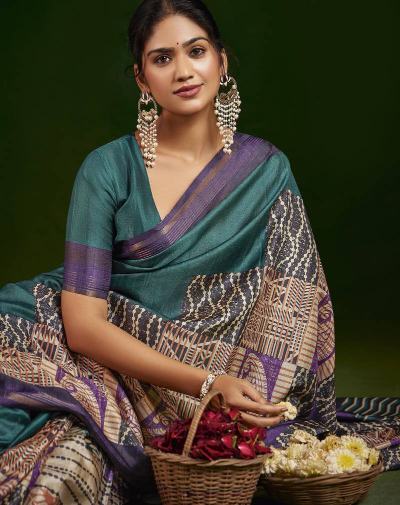 Teal color gathan silk blend fabric designer digital printed partywear saree