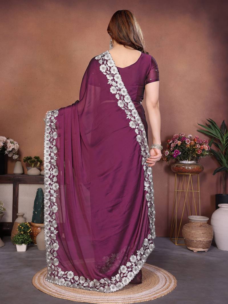 Wine color rangoli silk fabric designer embroidery work ceremonial saree