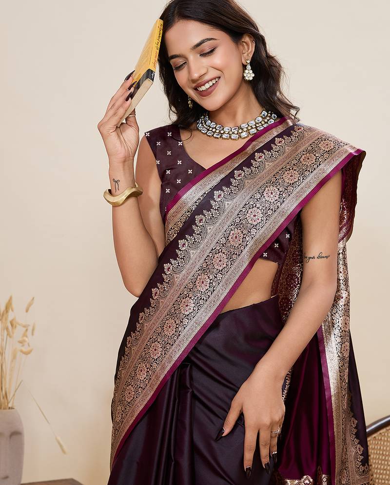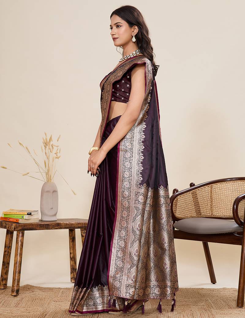 Wine color satin silk blend fabric wevon jari designer graceful partywear saree