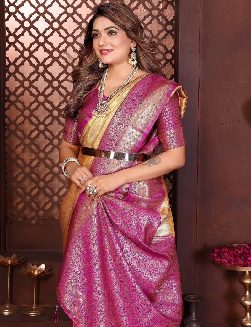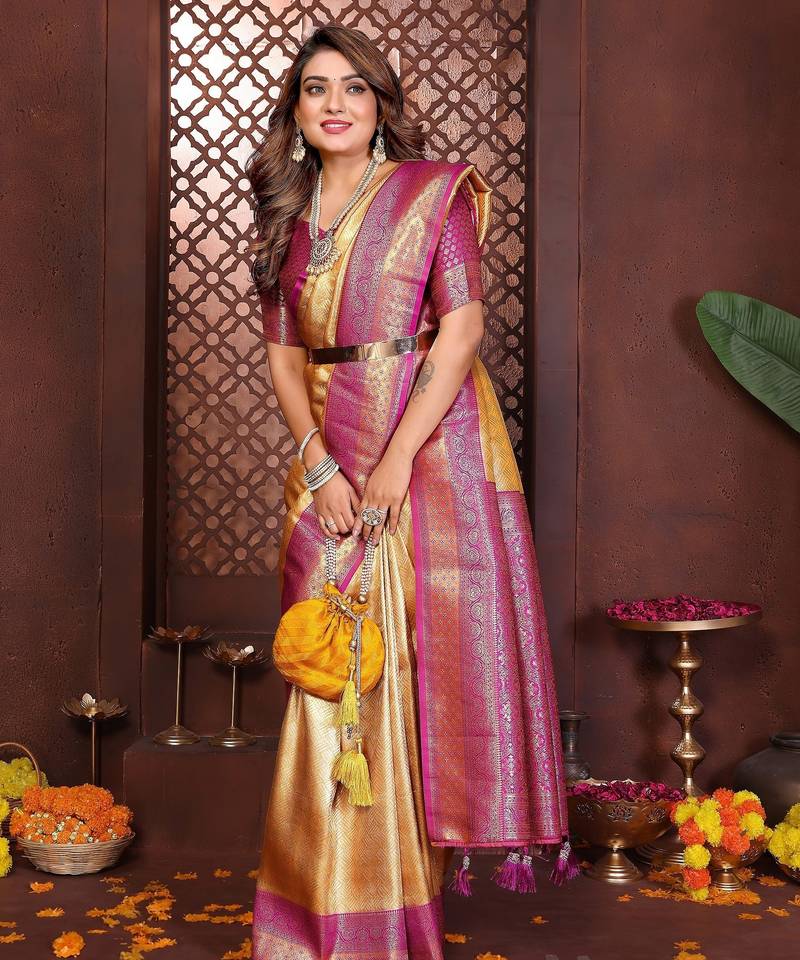 Yellow color banarasi tissue silk blend fabric jacquard woven designer saree