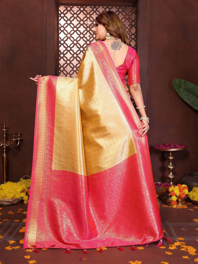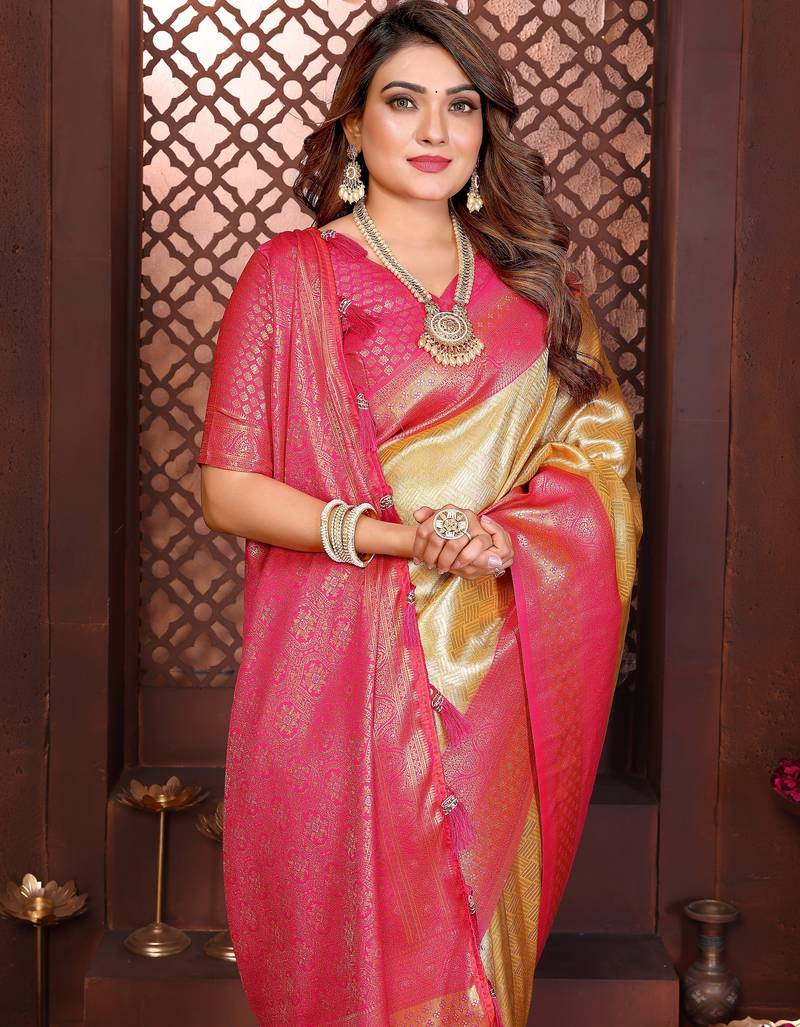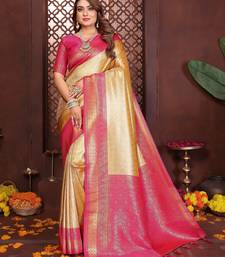 Yellow color banarasi tissue silk blend fabric jacquard woven designer saree