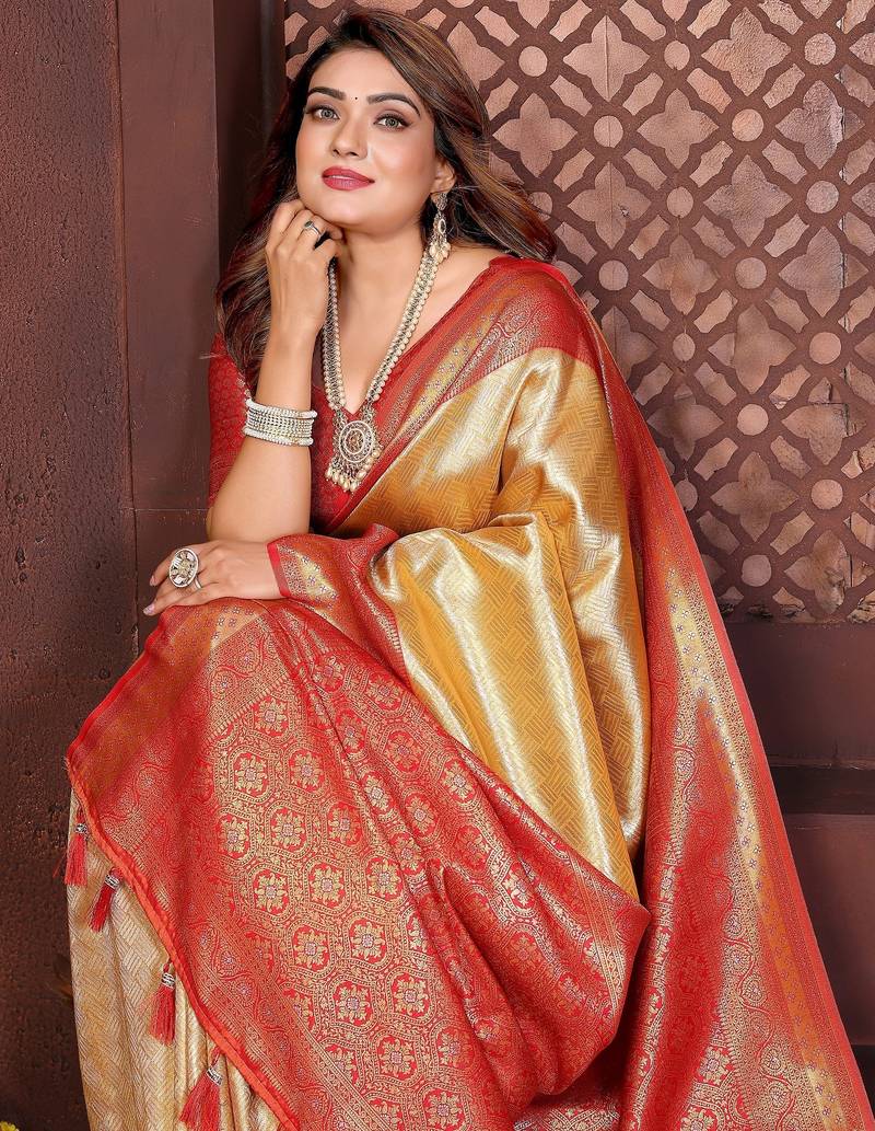 Yellow color banarasi tissue silk blend fabric jacquard woven designer saree
