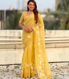 Yellow color chanda kora silk fabric beautful floral embroidery work ceremonial saree