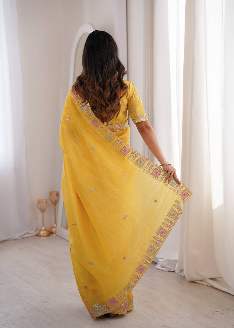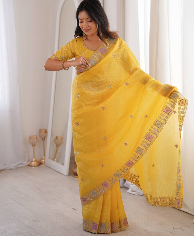 | Product Name | Yellow Color Gold Crunchy Silk Multy Thread Embroidery Work Rich Fancy Saree | |