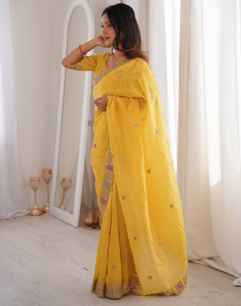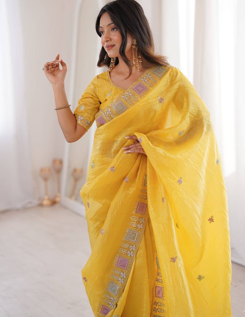 Yellow color gold crunchy silk multy thread embroidery work rich fancy saree