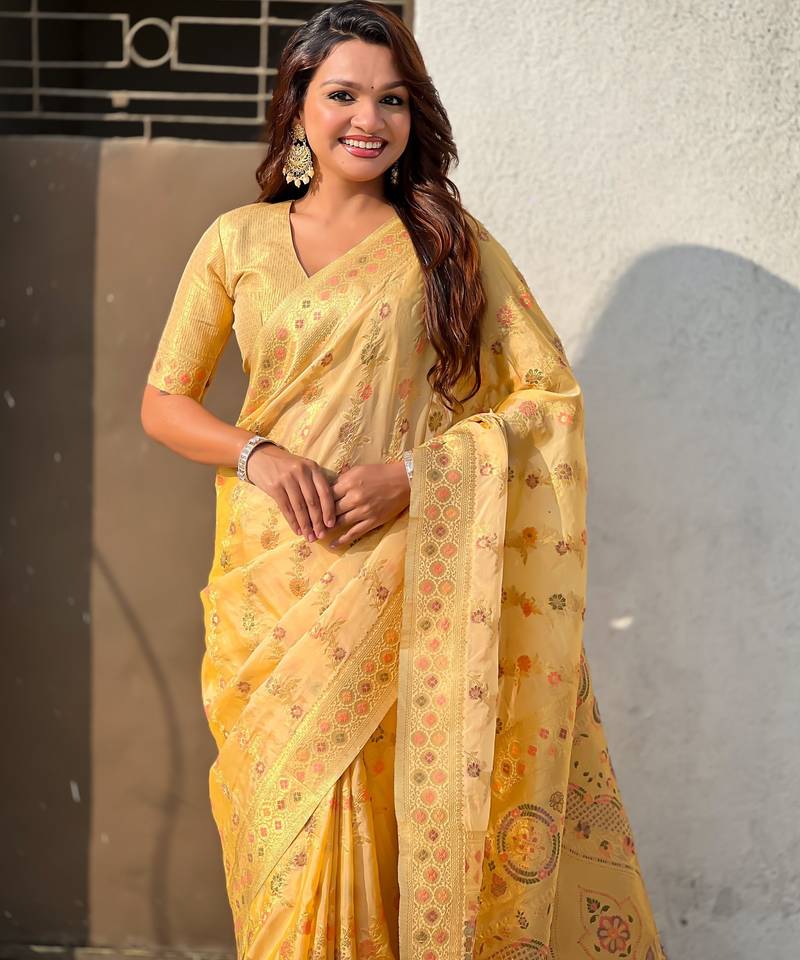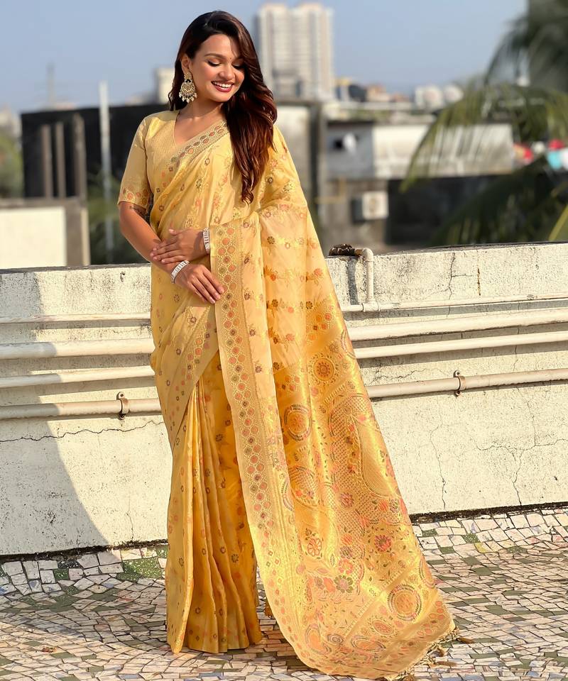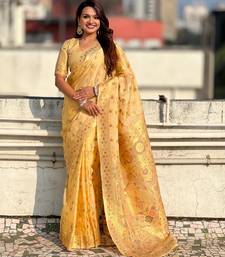 | Product Name | Yellow Color Kora Silk Fabric Woven Leheria Designer Saree | |