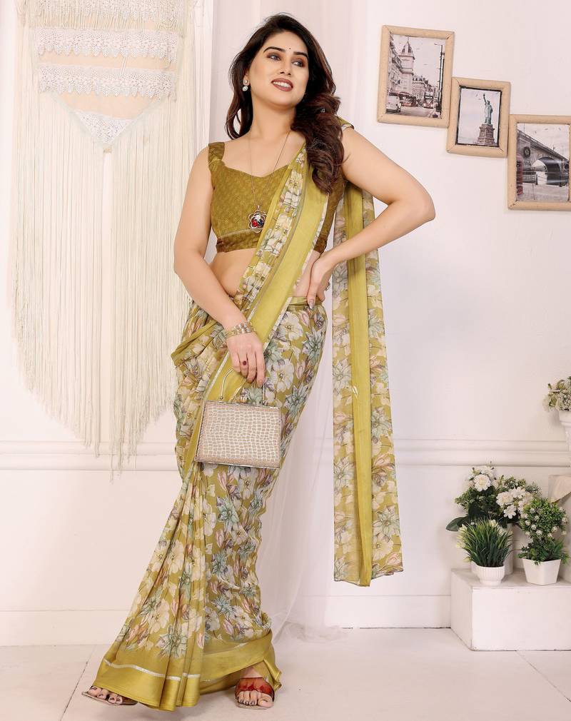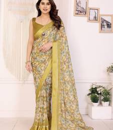 Yellow color moss satin patta designer flower printed ceremonial saree