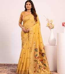 Yellow color muga cotton fabric paithani weaving designer partywear saree
