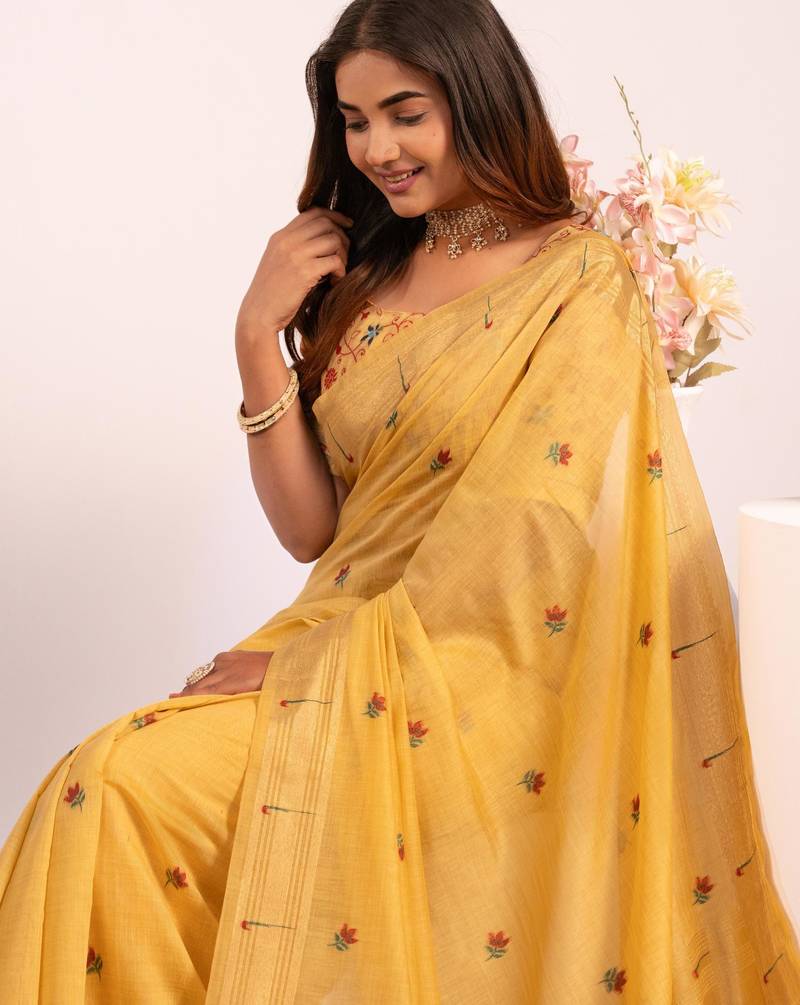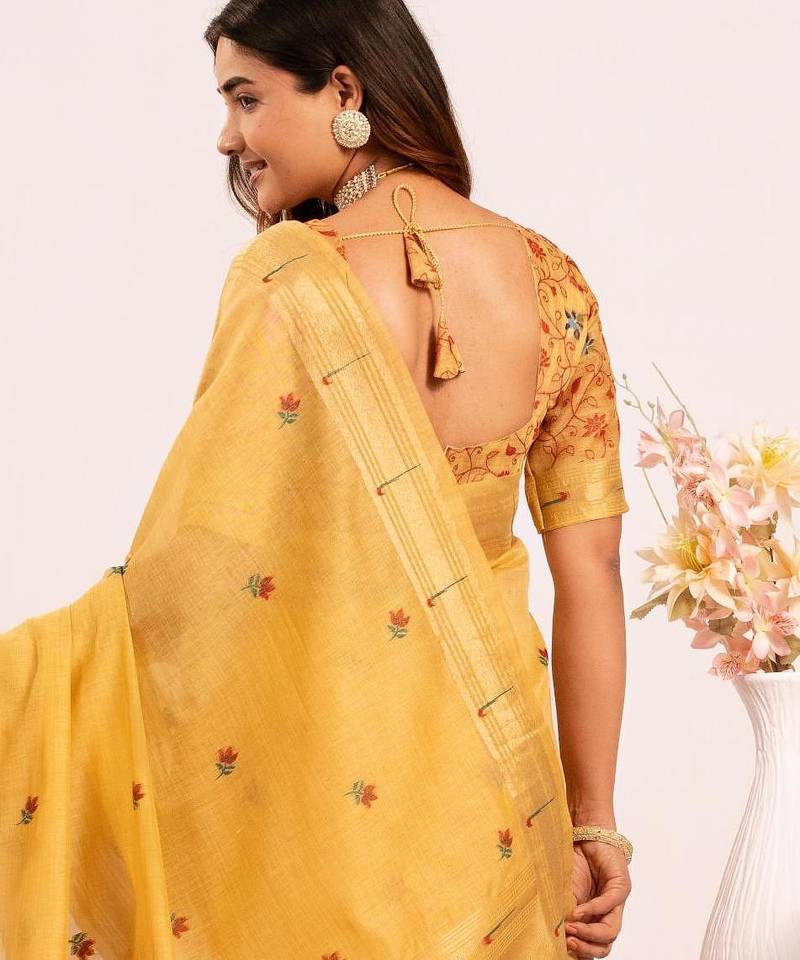 | • | Saree | : | Color- Yellow / Fabric- Blended Cotton |