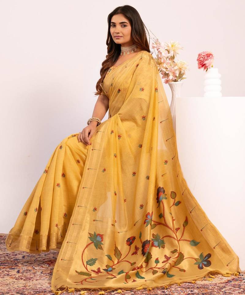 | Product Name | Yellow Color Muga Cotton Fabric Paithani Weaving Designer Partywear Saree | |