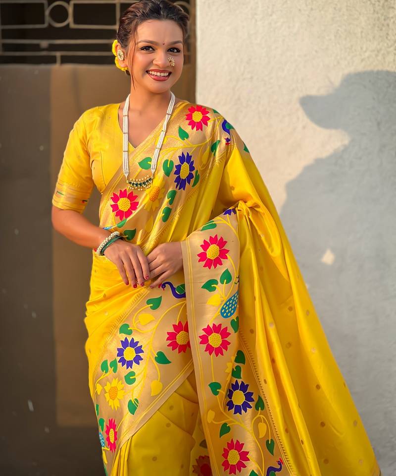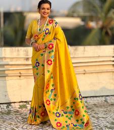 Yellow color paithani silk blend fabric woven designer partywear saree
