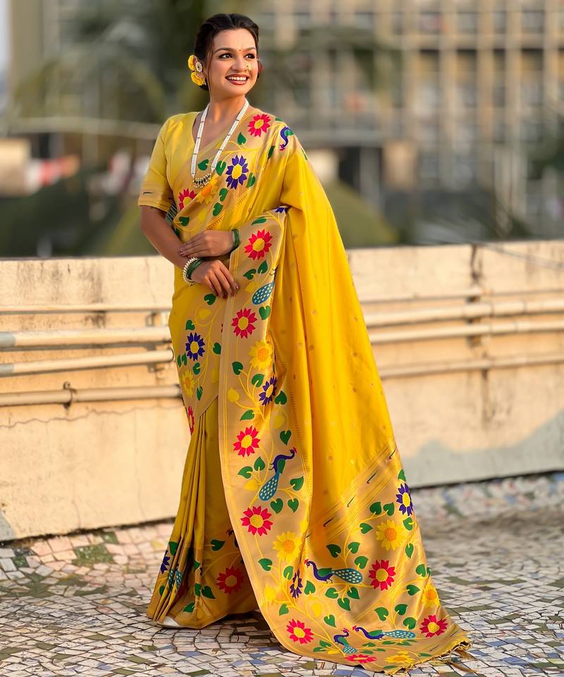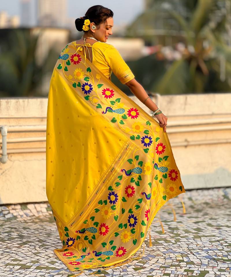 | Product Name | Yellow Color Paithani Silk Blend Fabric Woven Designer Partywear Saree | |