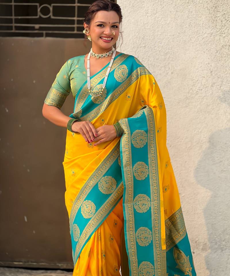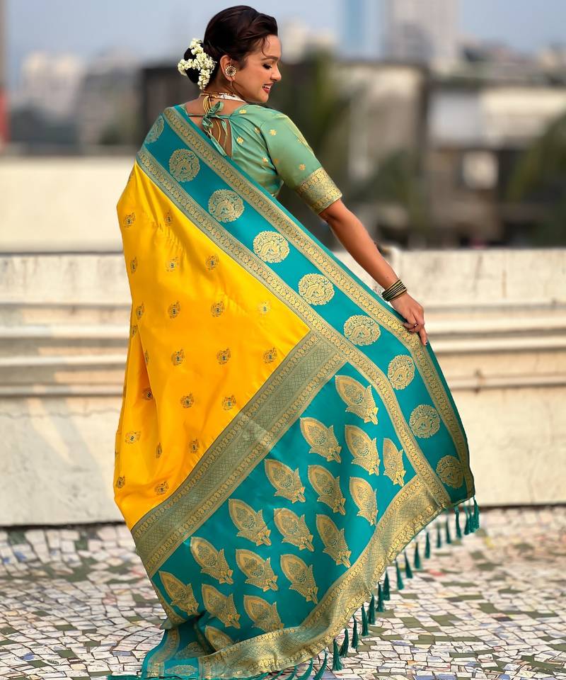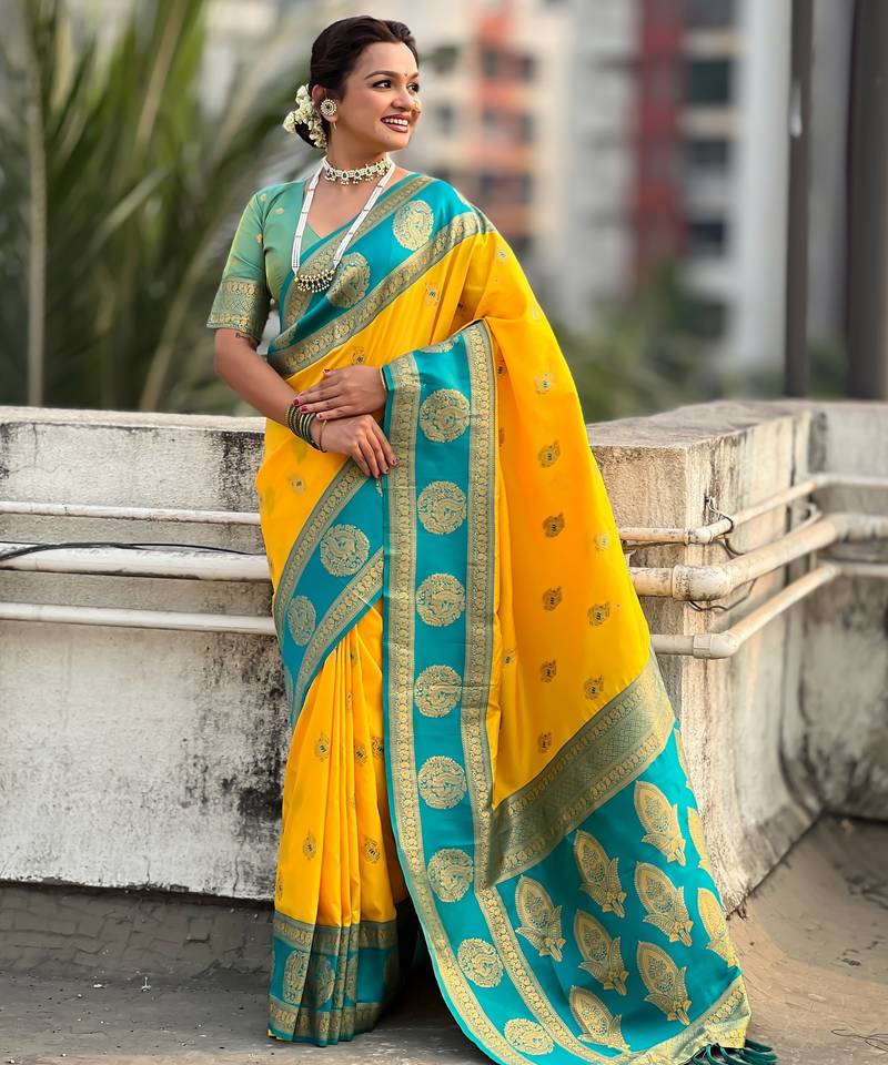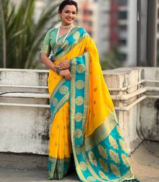 Yellow color soft silk fabric woven designer girlie rich look saree