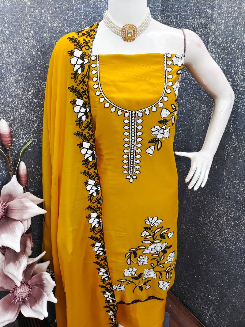 Yellow embroidered star georgette salwar kameez for festive wear unstitched