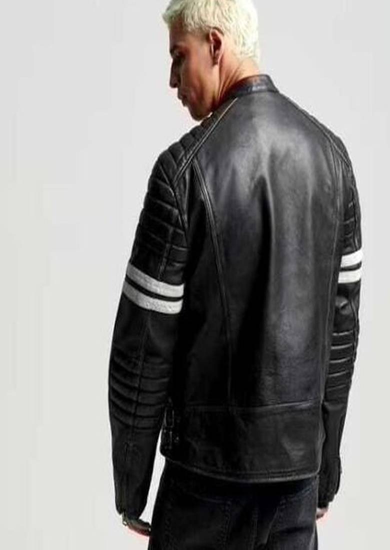Black quilted leather biker jacket moto style zip-up jacket with stripe detail