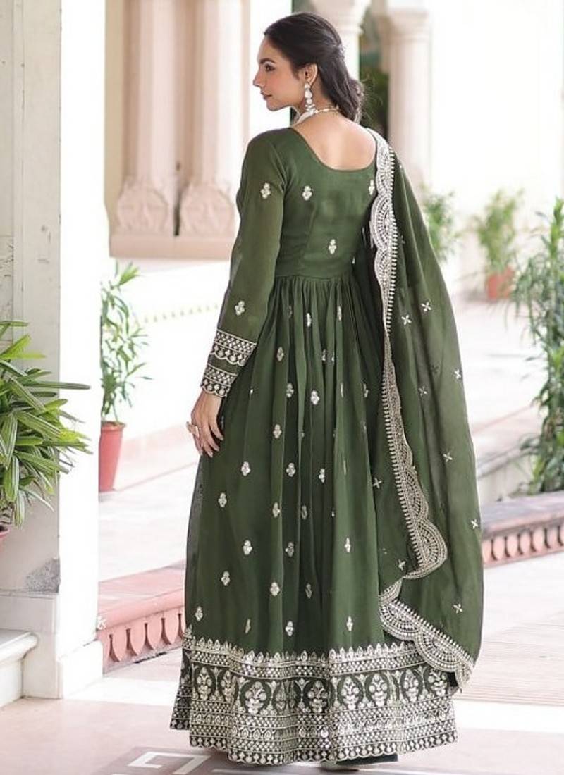 Dark green zari & sequins embroidered work roman stitched kurta gown & dupatta