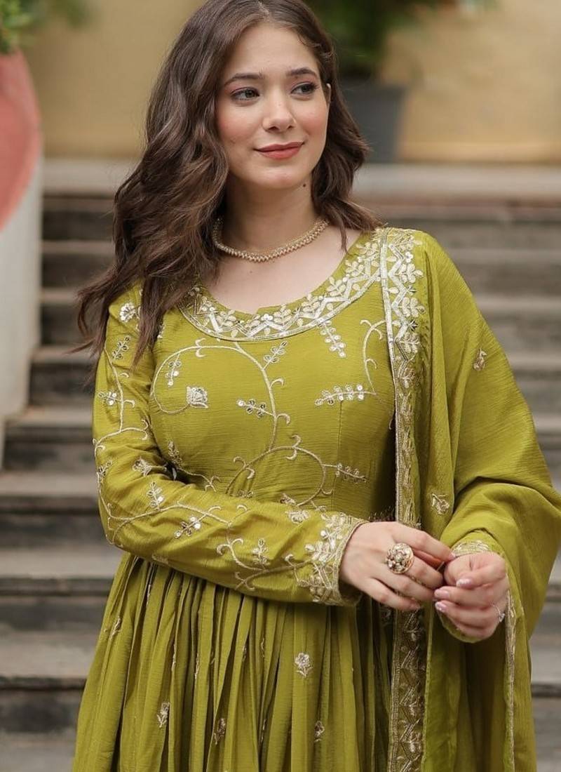 Green zari & sequins embroidered work chinon stitched kurta gown