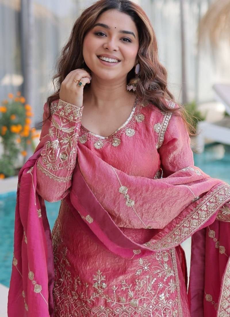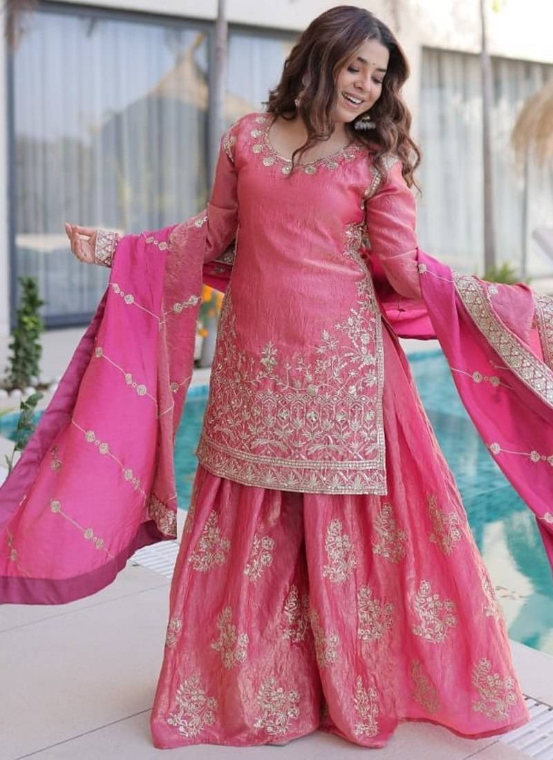 Peach zari & sequins embroidered work stitched kurta sharara with dupatta set for women