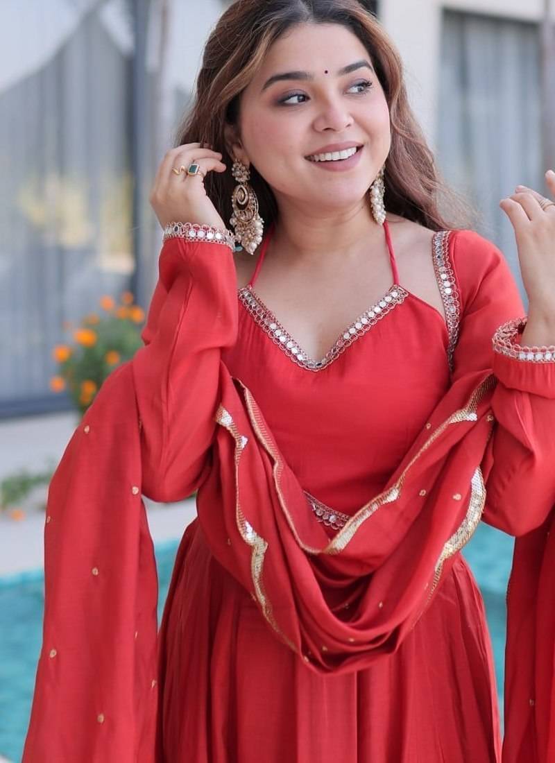 | Product Name | Red Mul Chanderi With Mirror Lace Work Stitched Kurti Pant With Dupatta | |