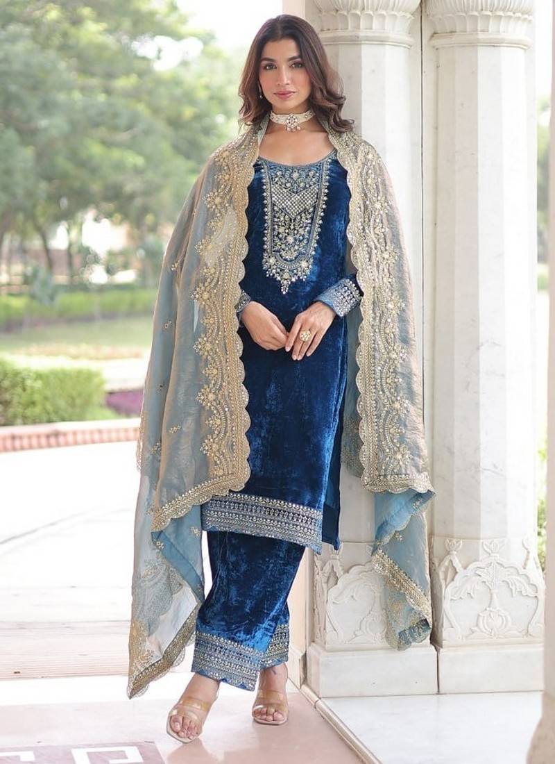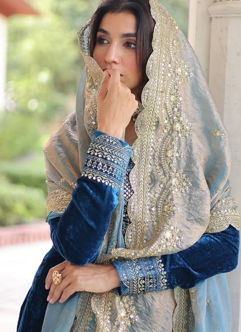 Teal zari & sequins embroidered velvet kurta bottom & dupatta stitched