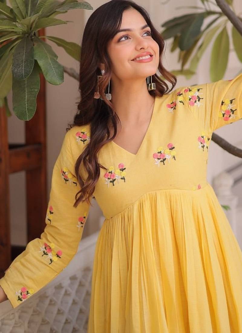 | Product Name | Yellow Embroidered Work Stitched Kurti With Pant Set | |