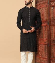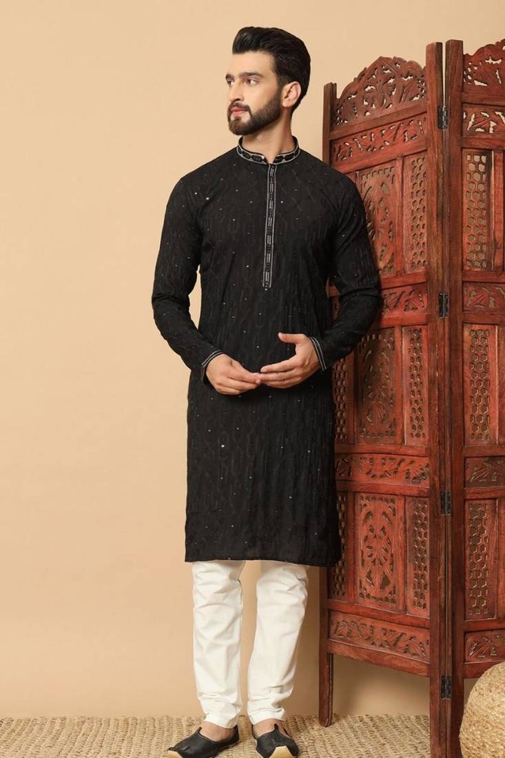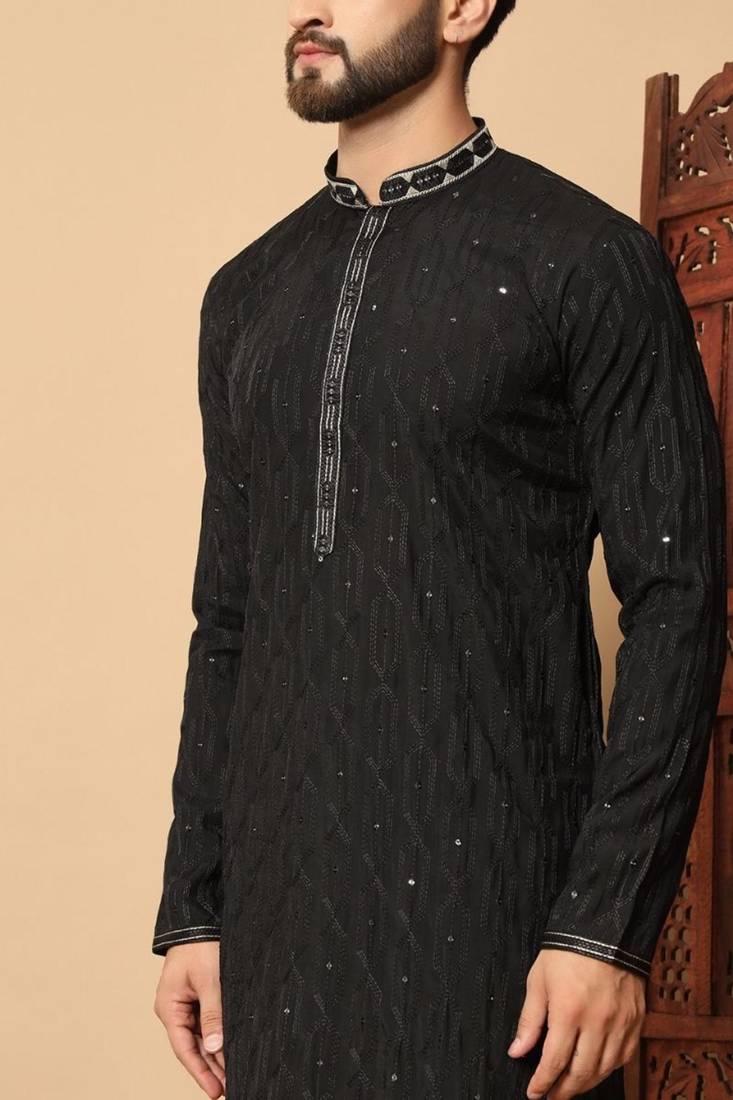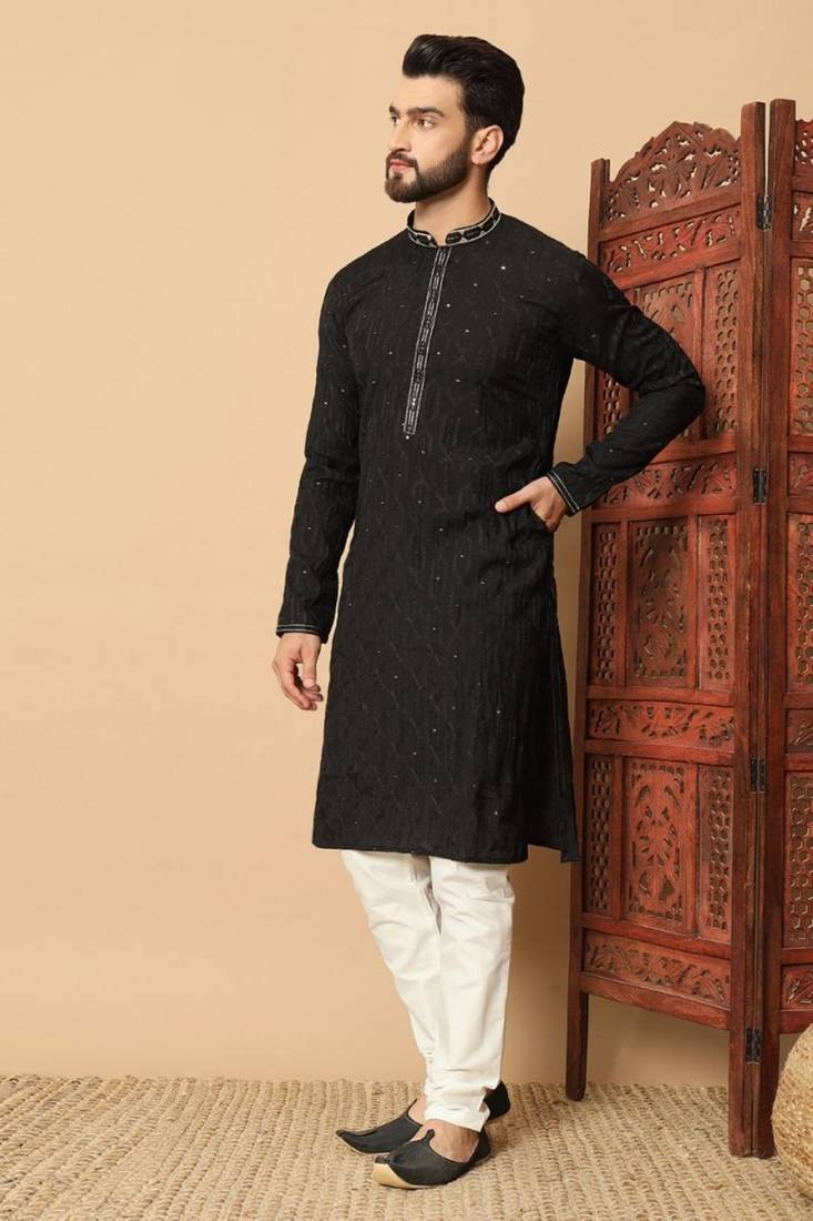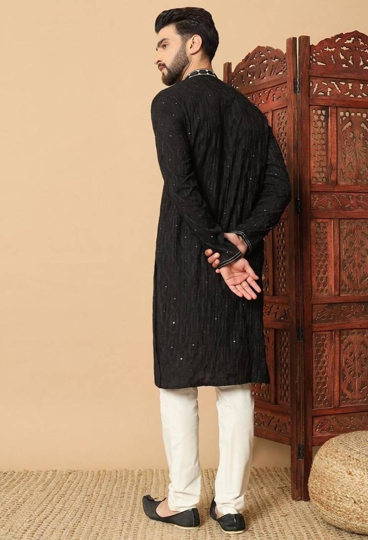 | Product Description | Elegant Black Premium Silk Kurta With Intricate Embroidery And Sequins Work, Paired With Raymond Cotton Pajama For A Rich Festive And Wedding Look |