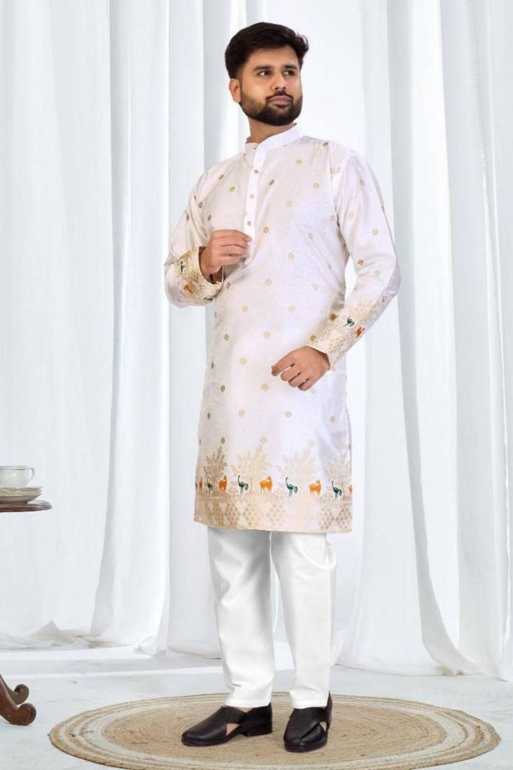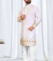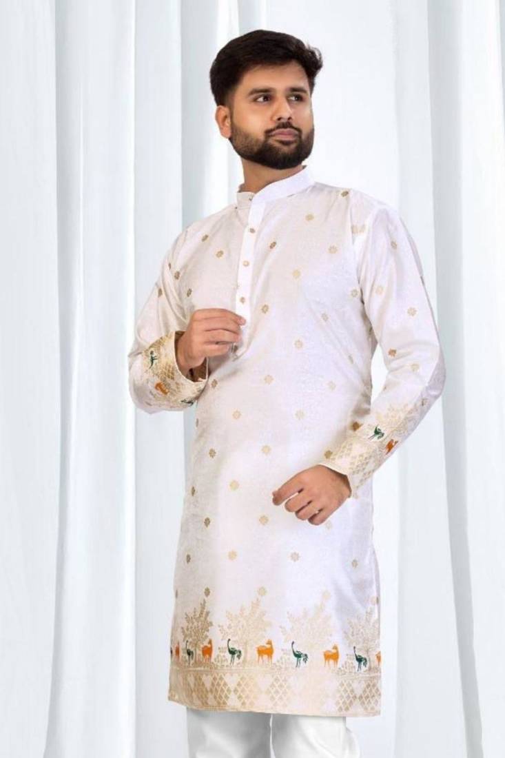 | Product Name | Classic White Silk Jacquard Embroidered Kurta With Cotton Pajama For Men | |