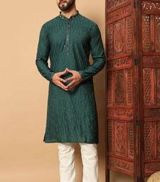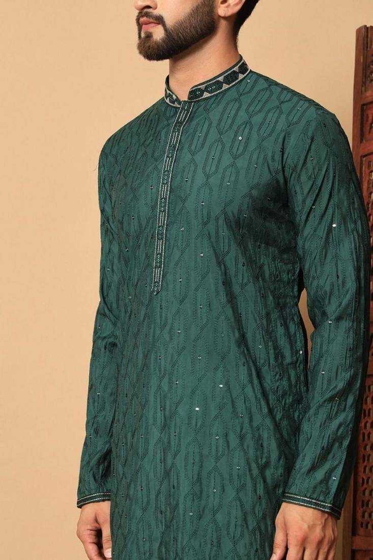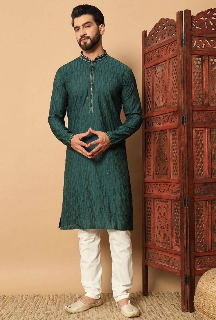 | Product Description | Royal Green Premium Silk Kurta With Elegant Embroidery And Delicate Sequins Accents, Styled With Raymond Cotton Pajama For Graceful Festive Wear |