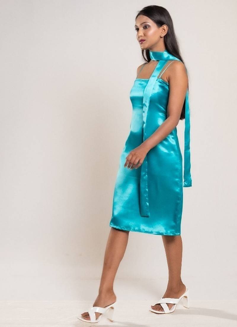 The Aqua Green Satin Bow Dress With Stole Shines With Soft Aqua Satin, Featuring A Charming Bow Detail And A Matching Stole—Perfect For Elegant Weddings, Parties, And Graceful Celebrations.
