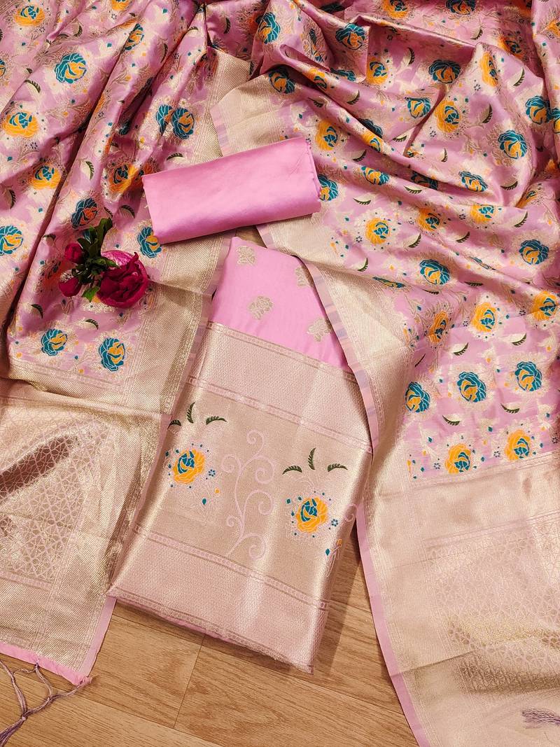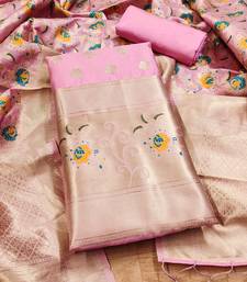 Baby pink soft banarasi silk pure zari woven design dress material unstitched