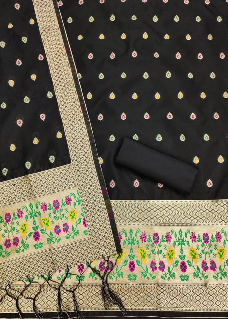 Black soft banarasi silk pure zari woven design dress material unstitched