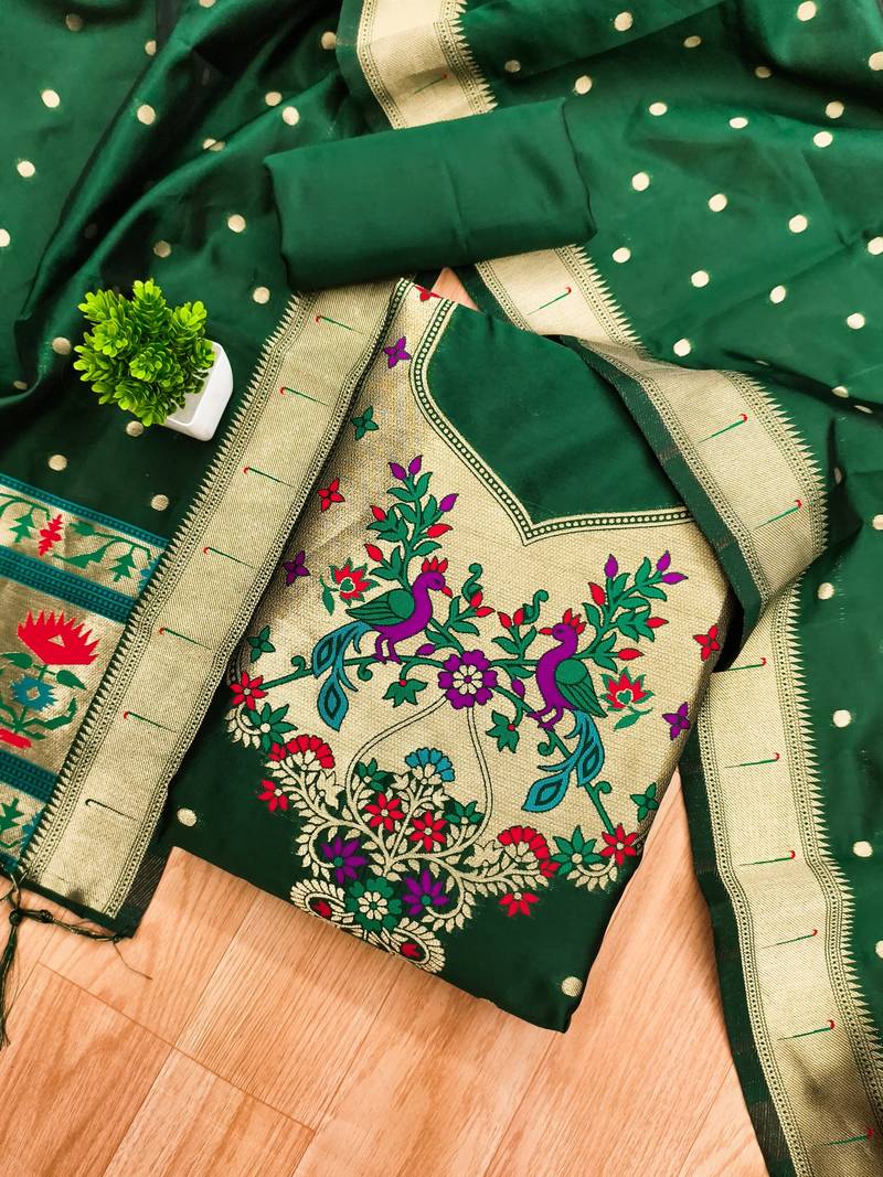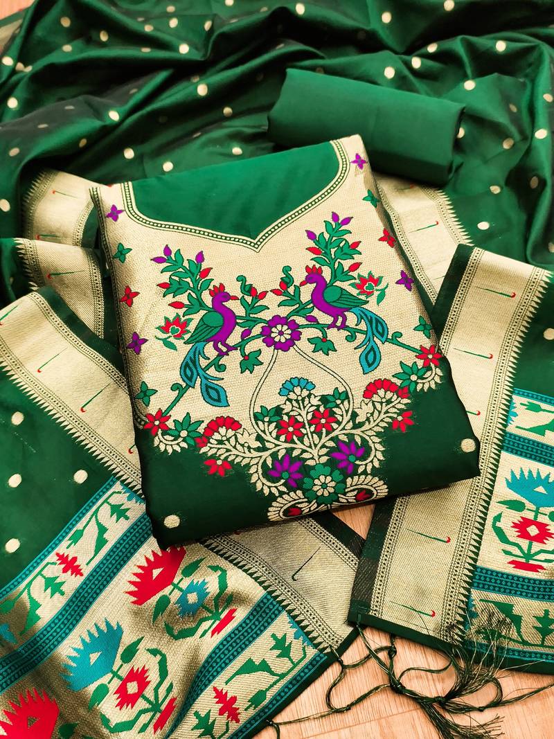 Bottle green soft banarasi silk pure zari woven design dress material unstitched