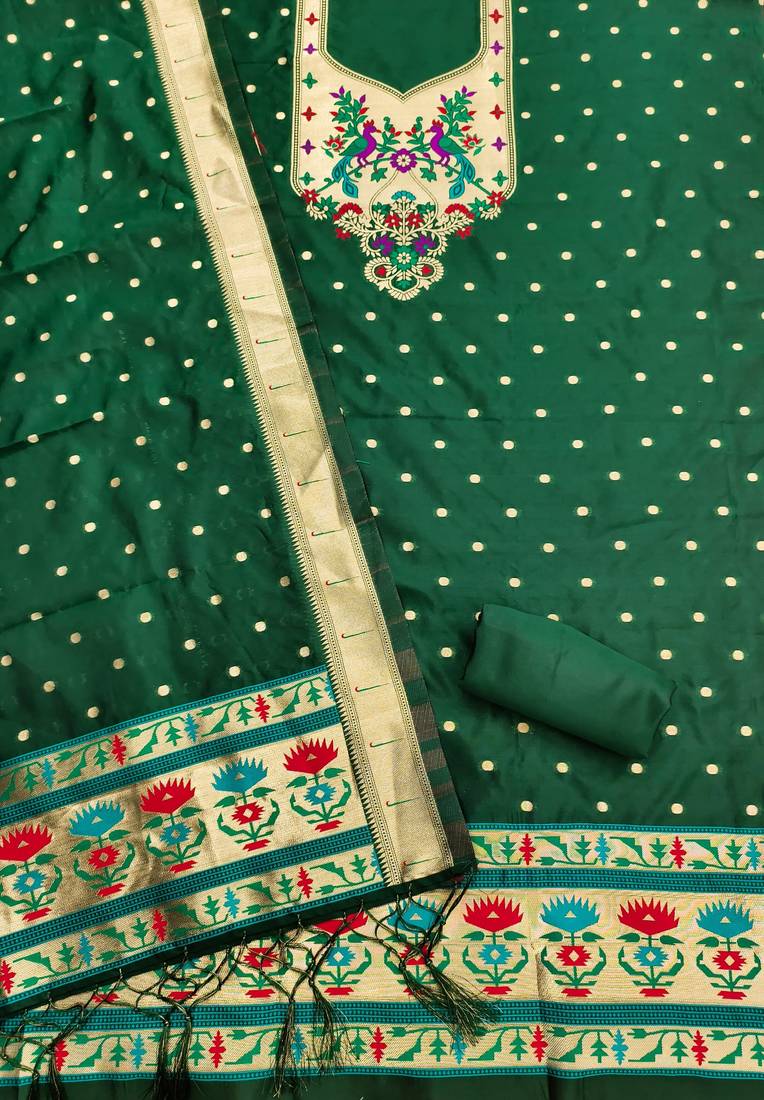 | Product Name | Bottle Green Soft Banarasi Silk Pure Zari Woven Design Dress Material | |