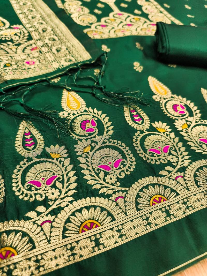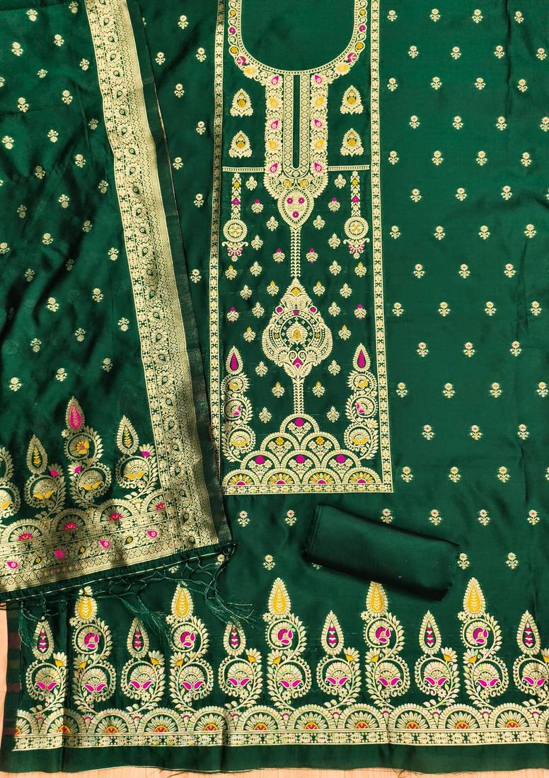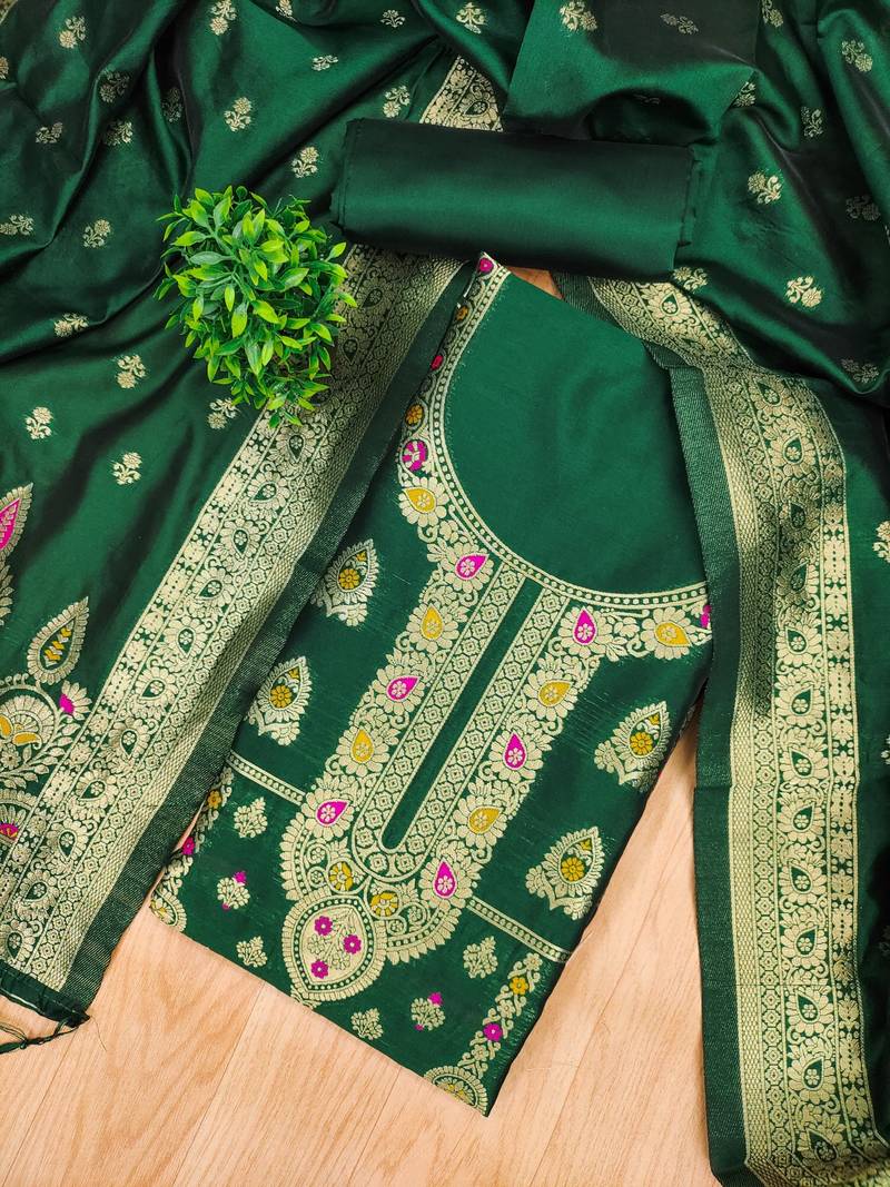 Bottle green soft banarasi silk pure zari woven design dress material unstitched
