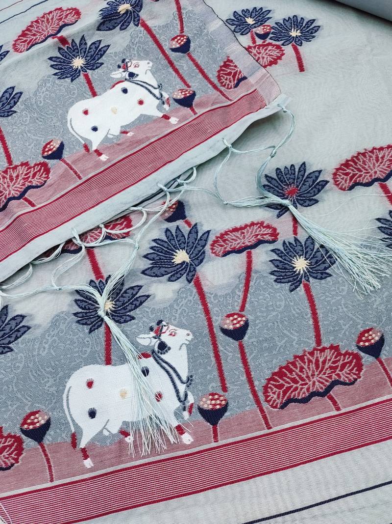 | Product Description | This Grey Muga Cotton Jamdani Weaving 3 Piece Dress Material Set Brings A Refined And Artistic Touch To Your Ethnic Wardrobe. The Top Showcases Traditional Jamdani Motifs With Beautifully Woven Lotus Patterns And A Charming Cow Design Along The Border, Giving It A Unique Handcrafted Appeal. The Dupatta Features Coordinated Jamdani Weaving With Soft Stripes And Matching Floral Motifs, Adding Elegance And Flow To The Overall Look. A Plain Bottom Fabric Completes The Unstitched Set, Allowing You To Tailor It To Your Preferred Style And Comfort. Perfect For Festive Occasions, Cultural Events, Or Daytime Functions, This Muga Cotton Dress Material Blends Tradition, Comfort, And Distinctive Jamdani Artistry. |