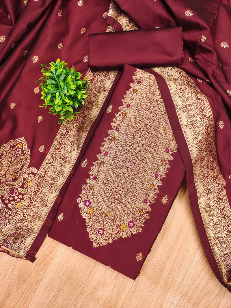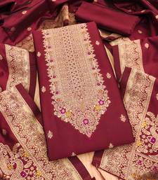 Maroon soft banarasi silk pure zari woven design dress material unstitched