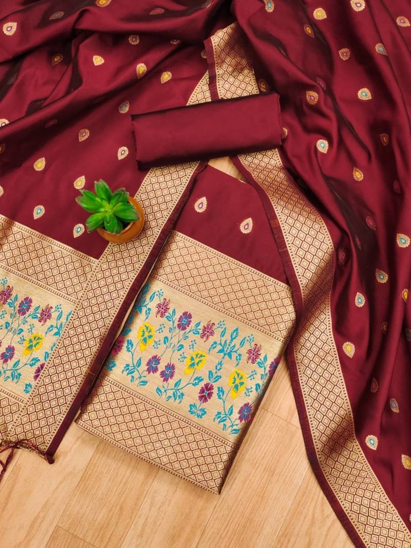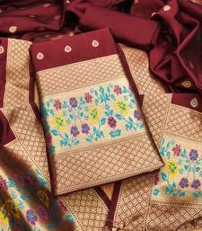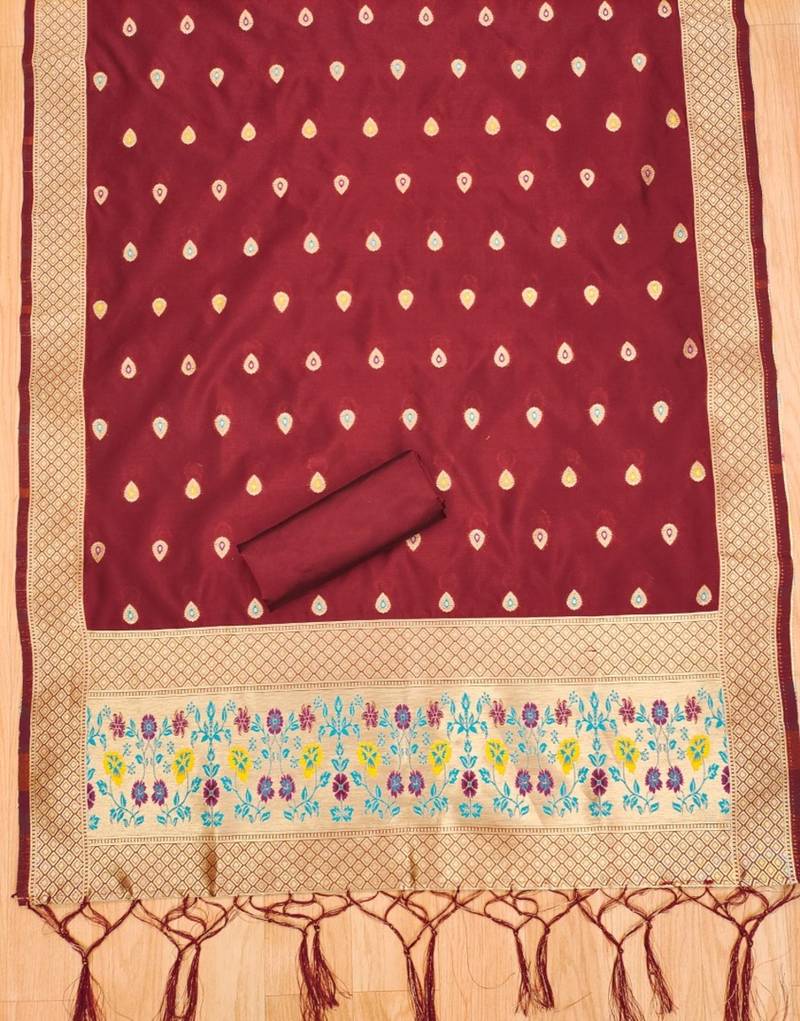 Maroon soft banarasi silk pure zari woven design dress material unstitched