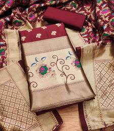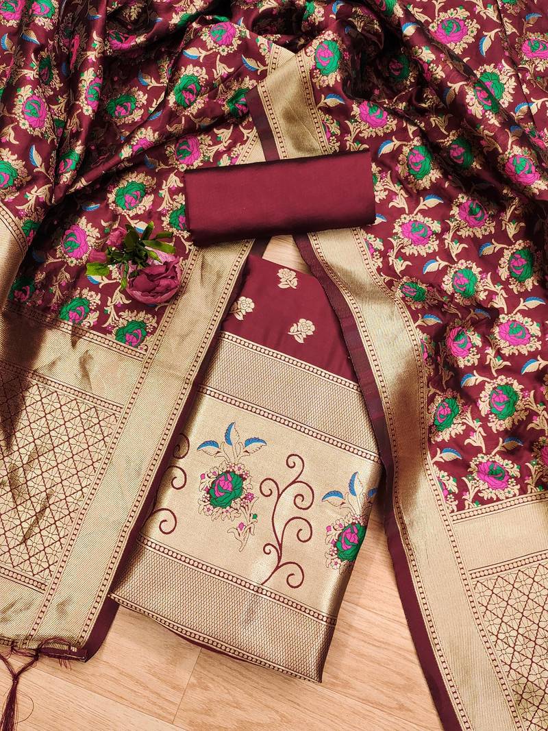 Maroon soft banarasi silk pure zari woven design dress material unstitched
