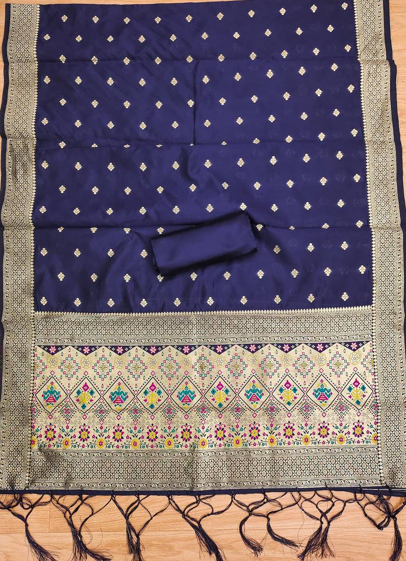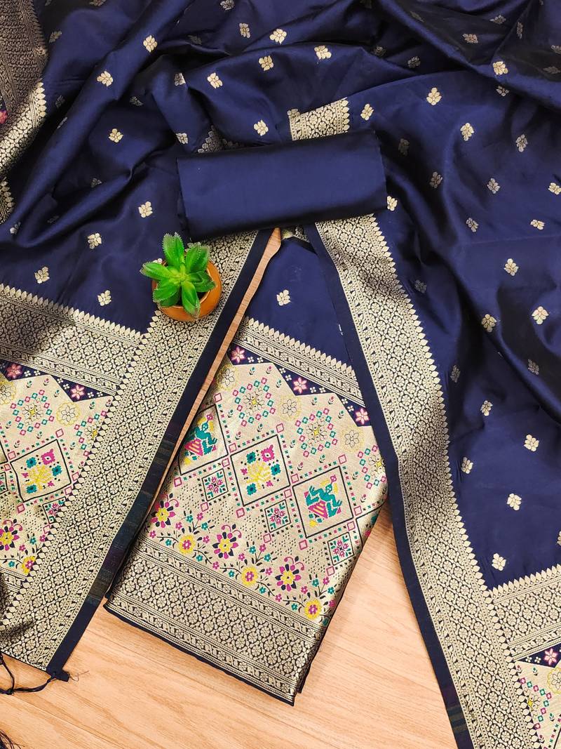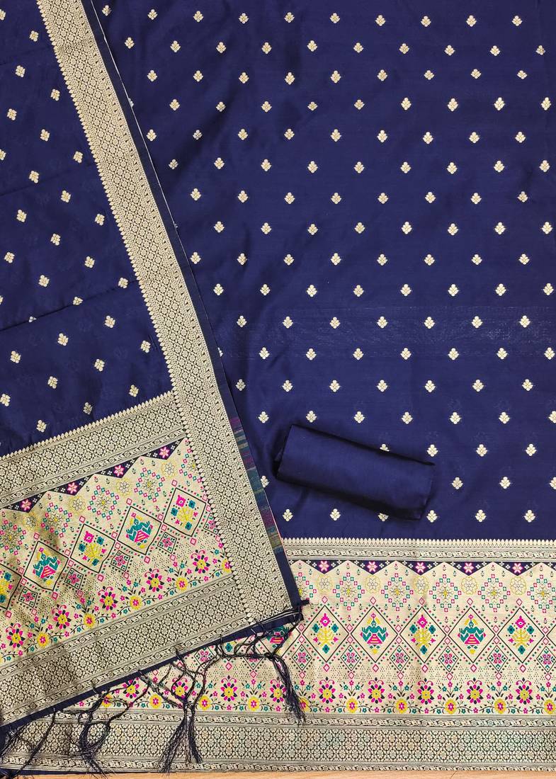 Navy blue soft banarasi silk pure zari woven design dress material unstitched
