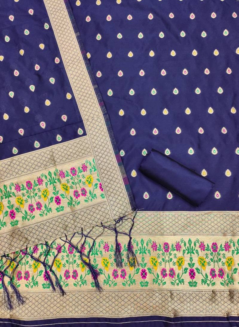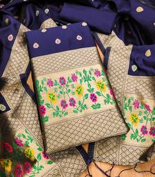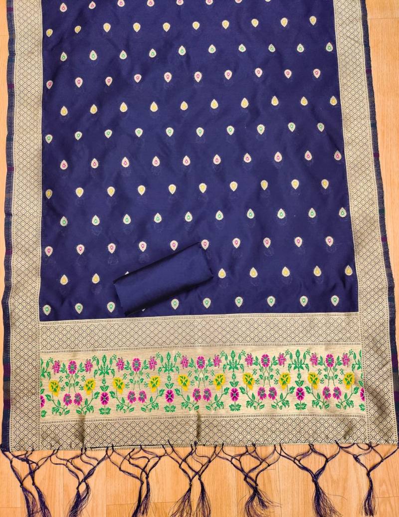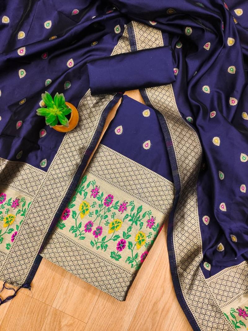 Navy blue soft banarasi silk pure zari woven design dress material unstitched