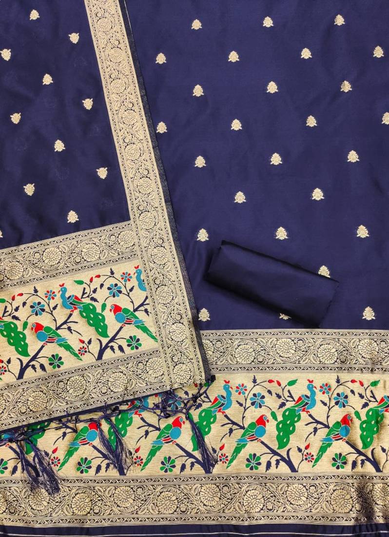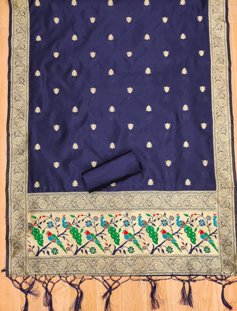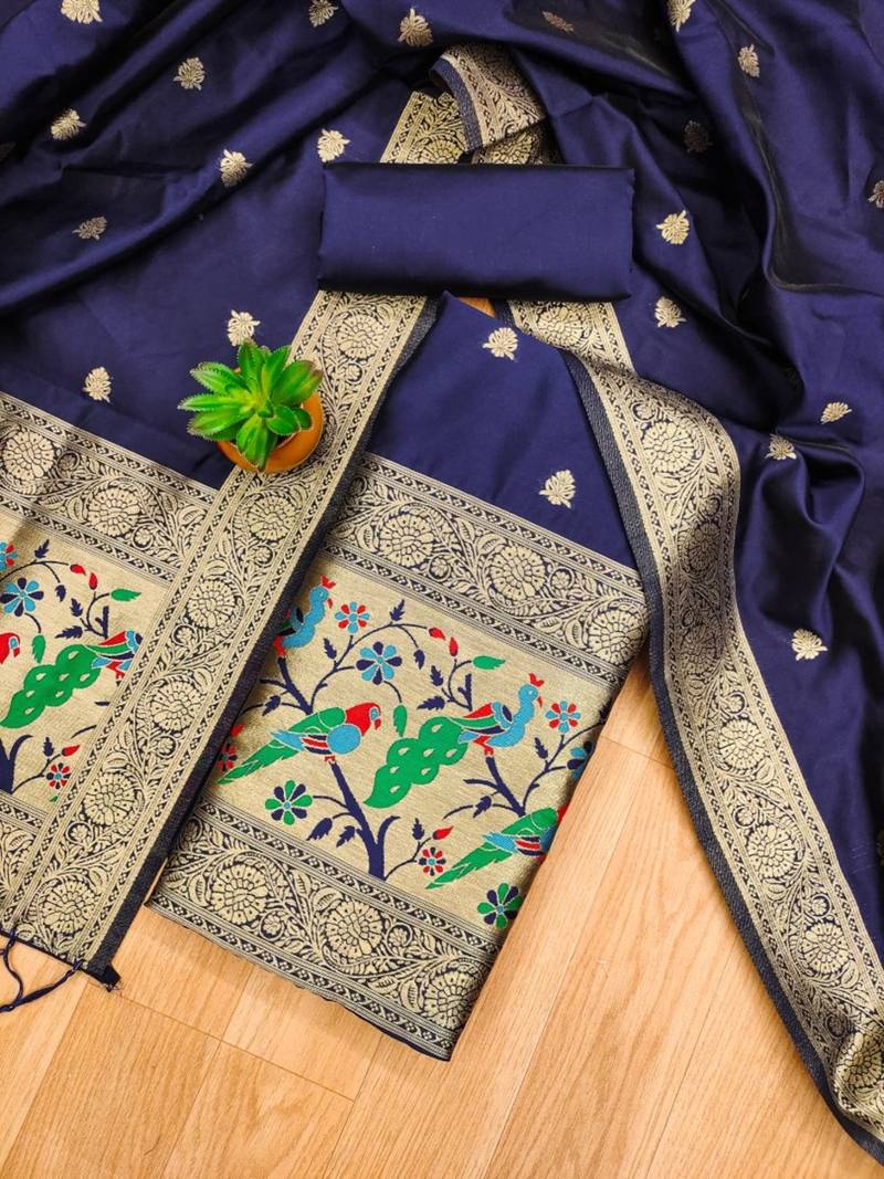 Navy blue soft banarasi silk pure zari woven design dress material unstitched