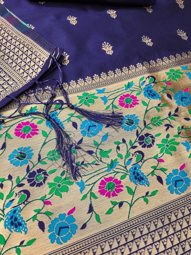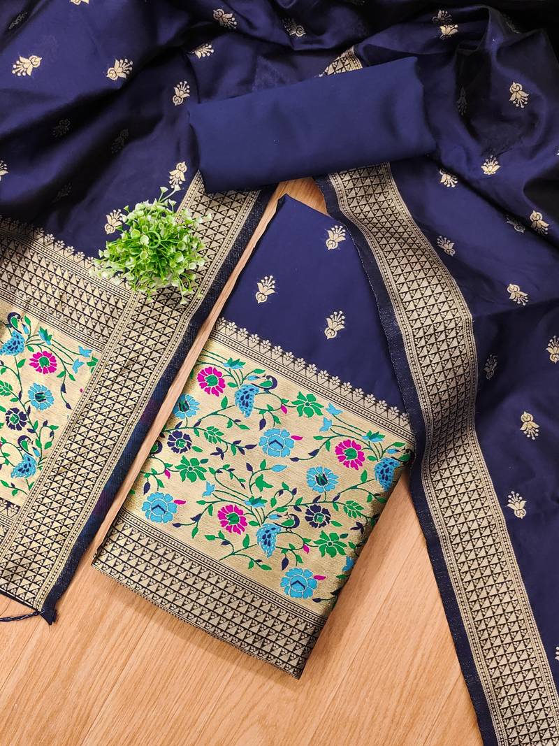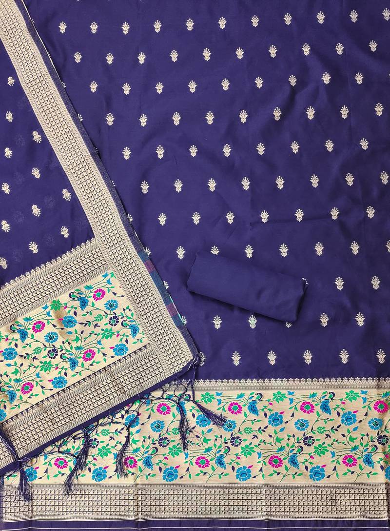 Navy blue soft banarasi silk pure zari woven design dress material unstitched