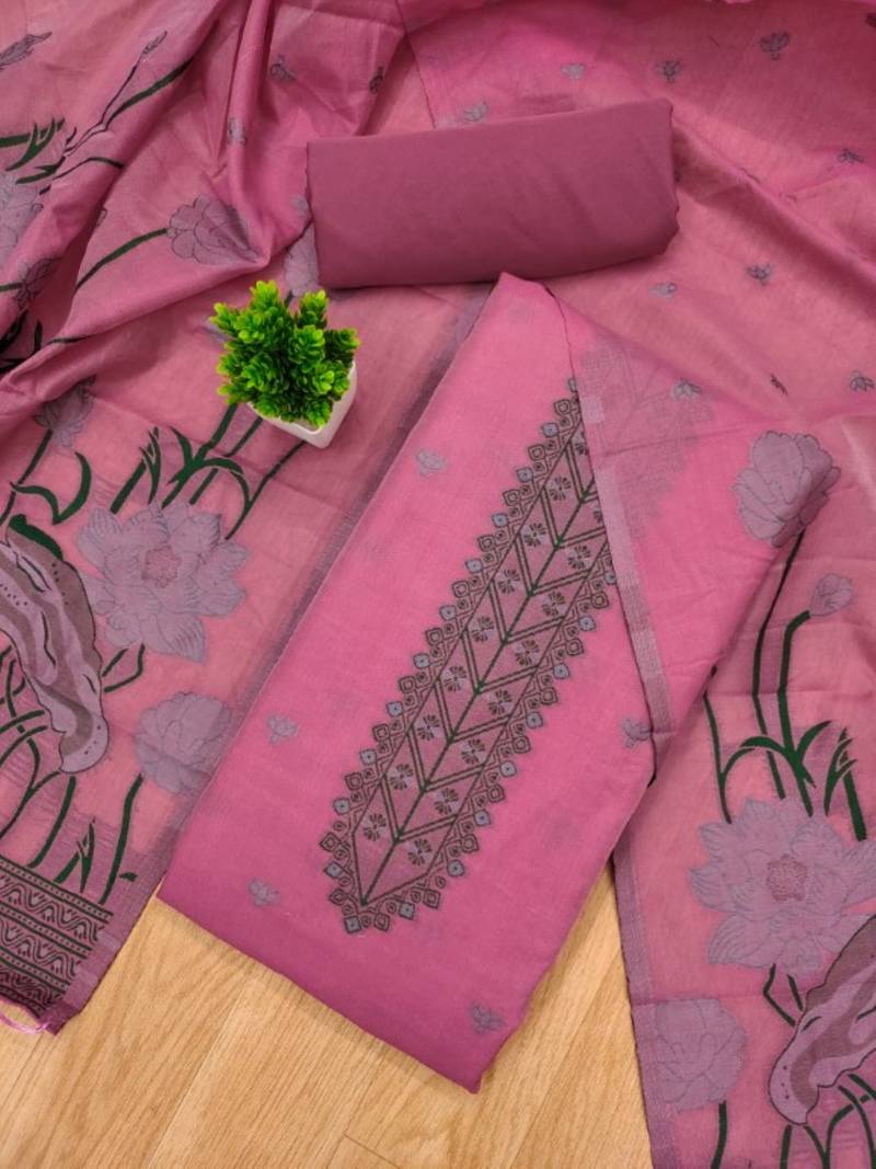Pink muga cotton 3 piece dress material unstitched