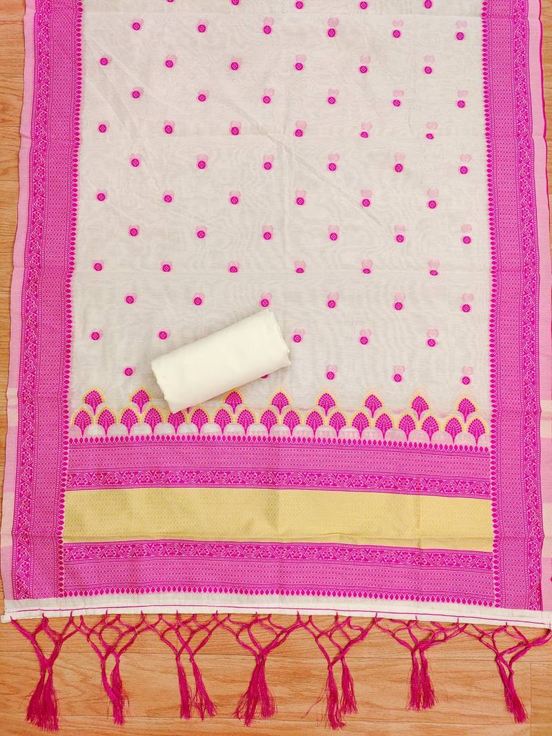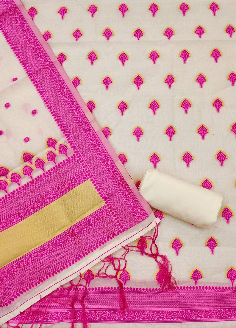 | Product Description | This Pink Resham Weaving Chanderi Cotton 3 Piece Dress Material Set Brings A Subtle, Elegant Look With Its Beautifully Crafted Detailing. The Unstitched Top Features Delicate Resham Embroidery In Pink And Mustard Tones, Creating A Refined Pattern That Enhances Its Traditional Charm. The Dupatta Carries Coordinated Weaving Borders And Matching Motifs, Giving It A Graceful And Stylish Finish. Paired With A Plain Bottom Fabric, The Set Allows You To Stitch A Customized And Comfortable Outfit Suited To Your Personal Style. Perfect For Casual Functions, Festive Gatherings, Or Everyday Ethnic Wear, This Chanderi Cotton Dress Material Offers A Blend Of Comfort, Durability, And Understated Sophistication. |