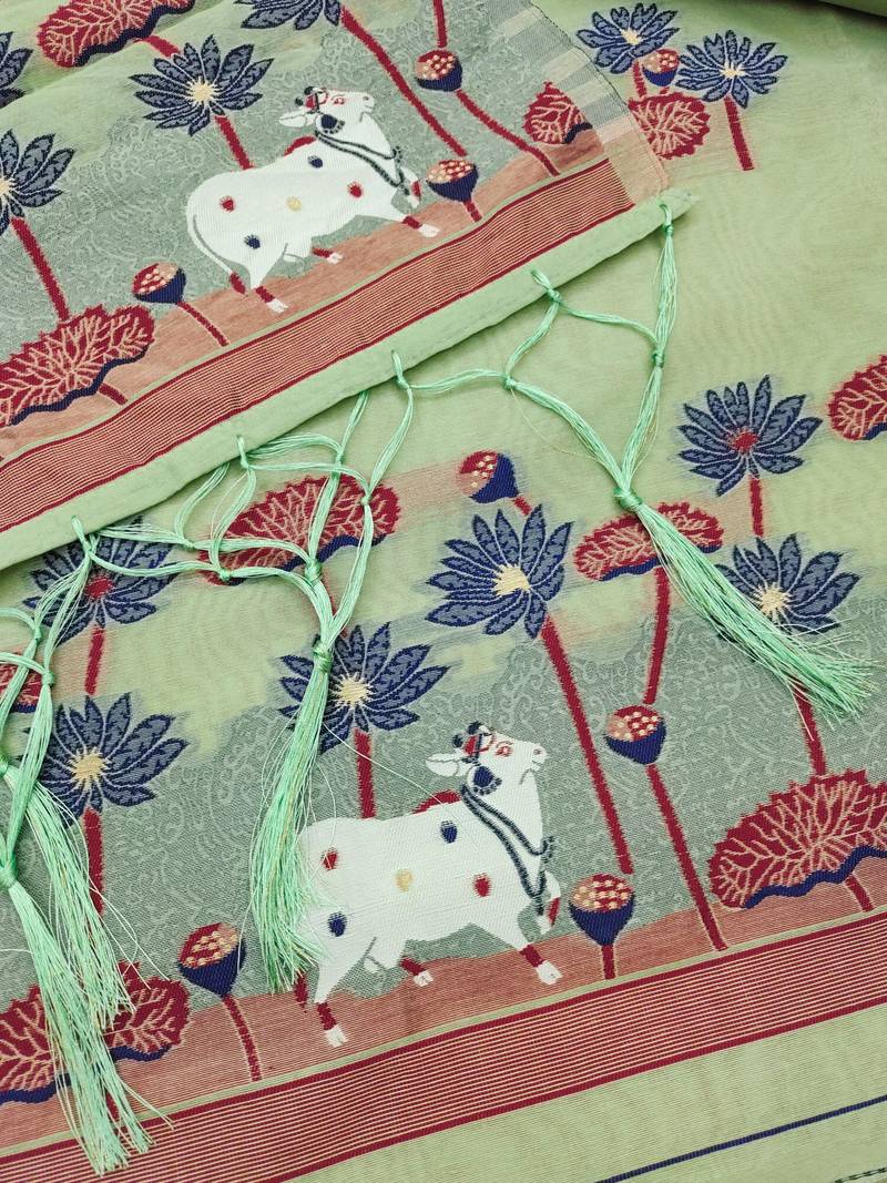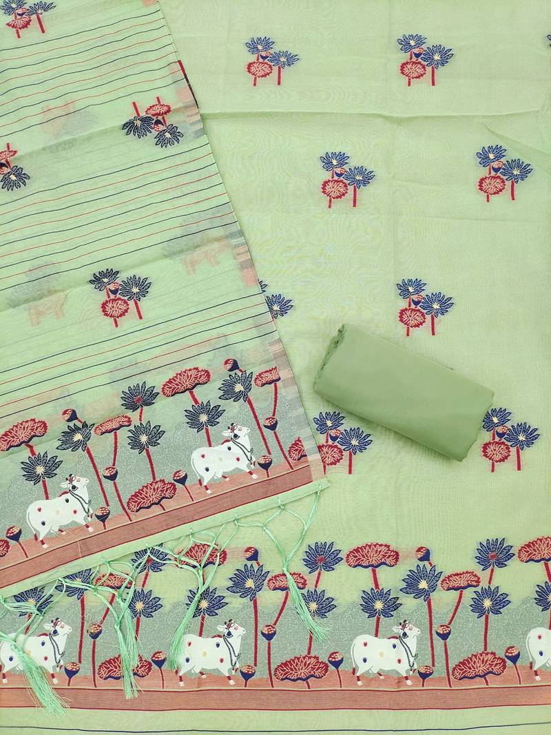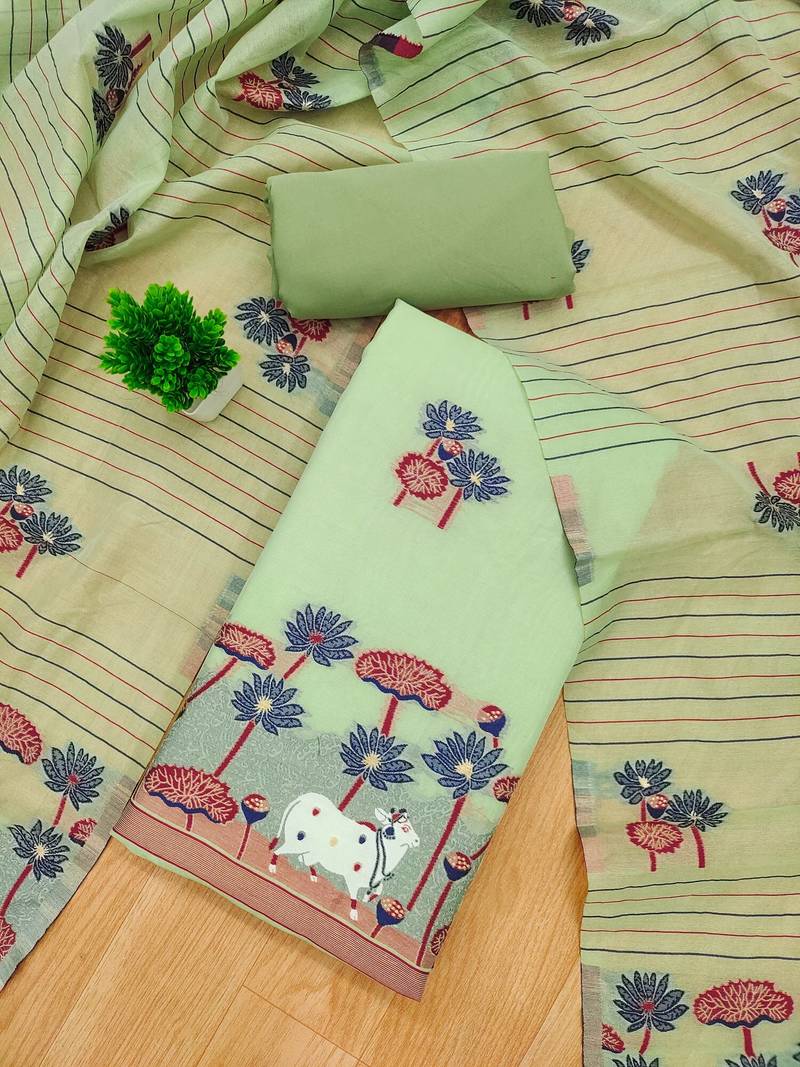 | Product Description | This Pista Muga Cotton Jamdani Weaving 3 Piece Dress Material Set Brings A Refined And Artistic Touch To Your Ethnic Wardrobe. The Top Showcases Traditional Jamdani Motifs With Beautifully Woven Lotus Patterns And A Charming Cow Design Along The Border, Giving It A Unique Handcrafted Appeal. The Dupatta Features Coordinated Jamdani Weaving With Soft Stripes And Matching Floral Motifs, Adding Elegance And Flow To The Overall Look. A Plain Bottom Fabric Completes The Unstitched Set, Allowing You To Tailor It To Your Preferred Style And Comfort. Perfect For Festive Occasions, Cultural Events, Or Daytime Functions, This Muga Cotton Dress Material Blends Tradition, Comfort, And Distinctive Jamdani Artistry. |