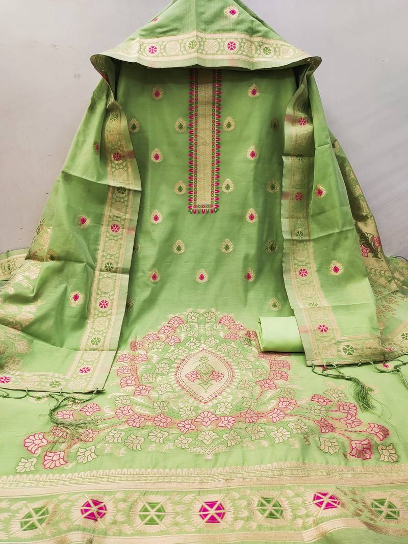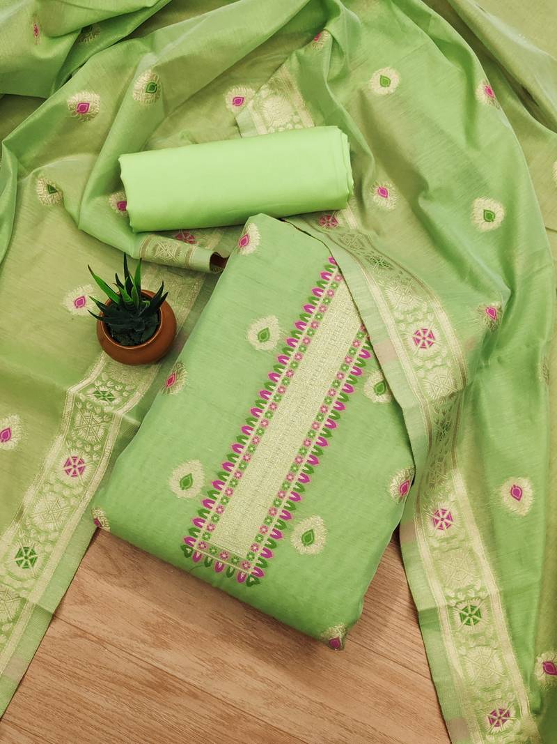 Pista green chanderi cotton 3 piece dress material unstitched