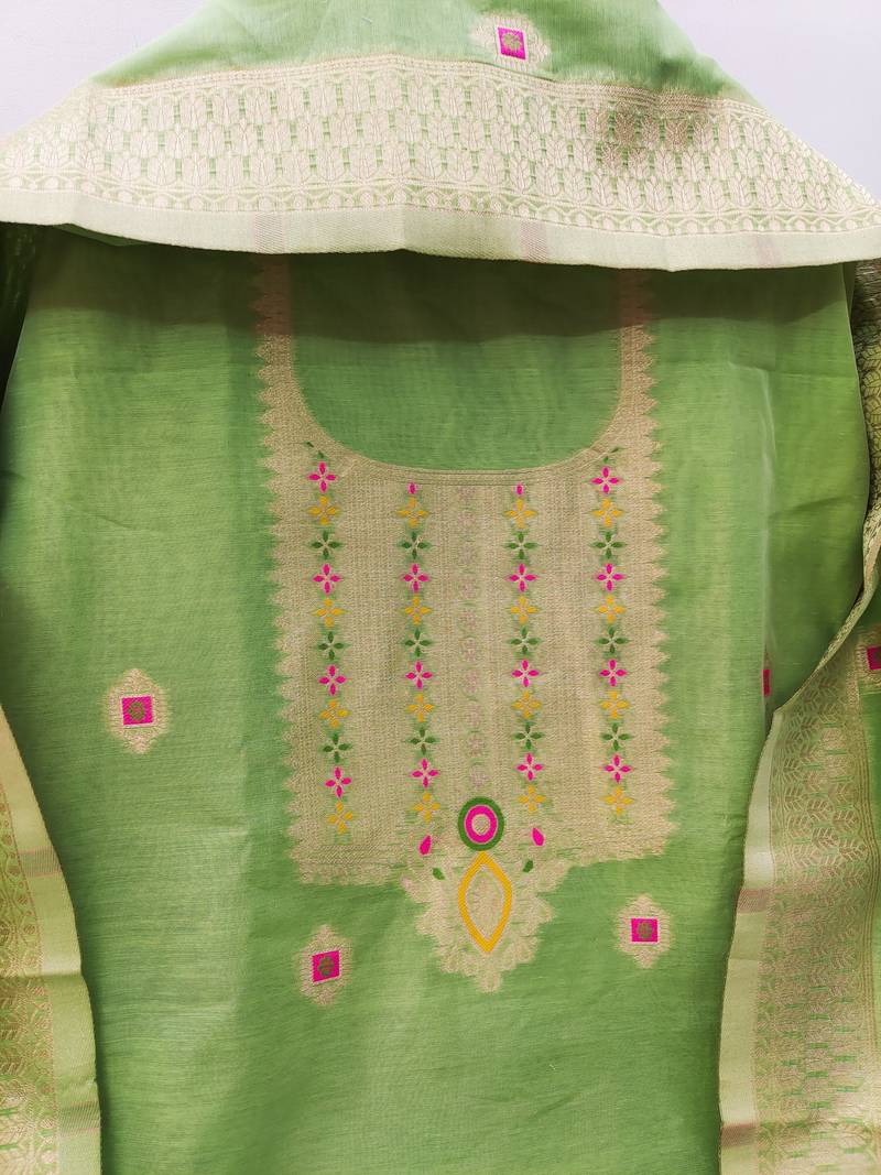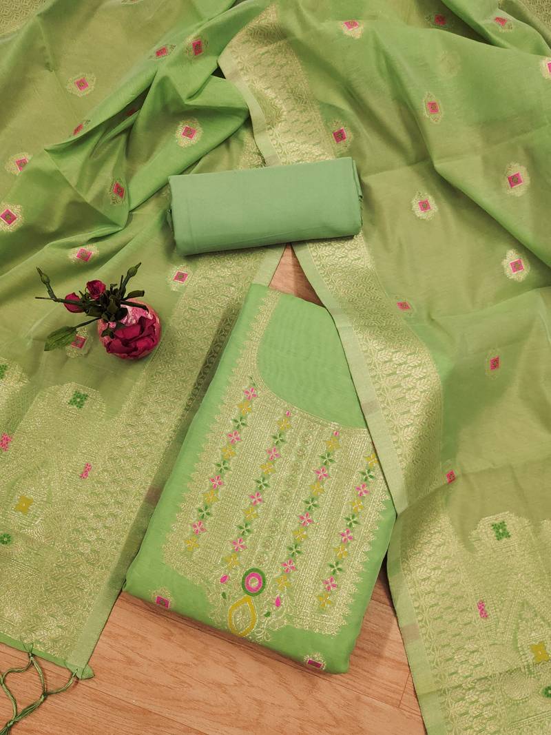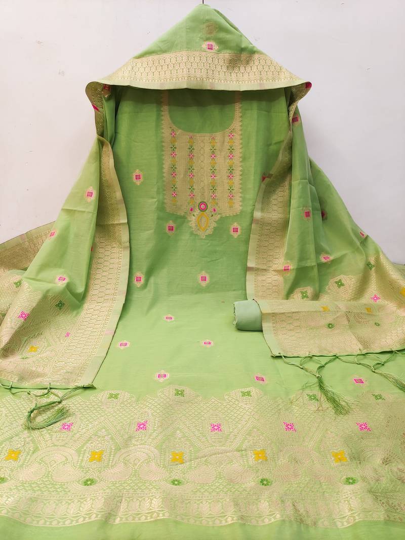 Pista green chanderi cotton 3 piece dress material unstitched