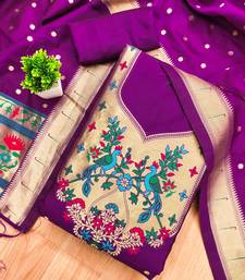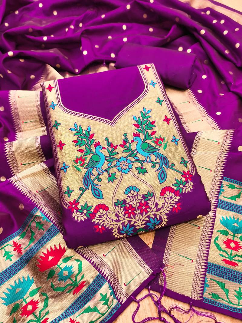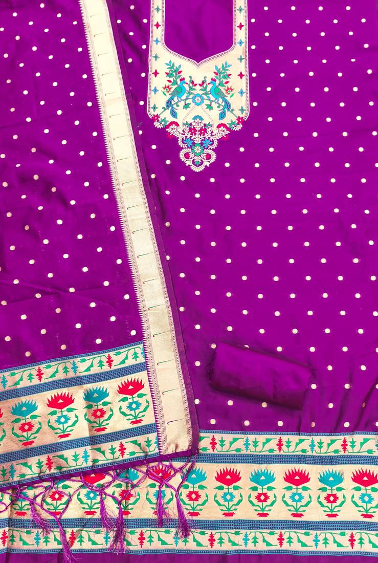 Purple soft banarasi silk pure zari woven design dress material unstitched